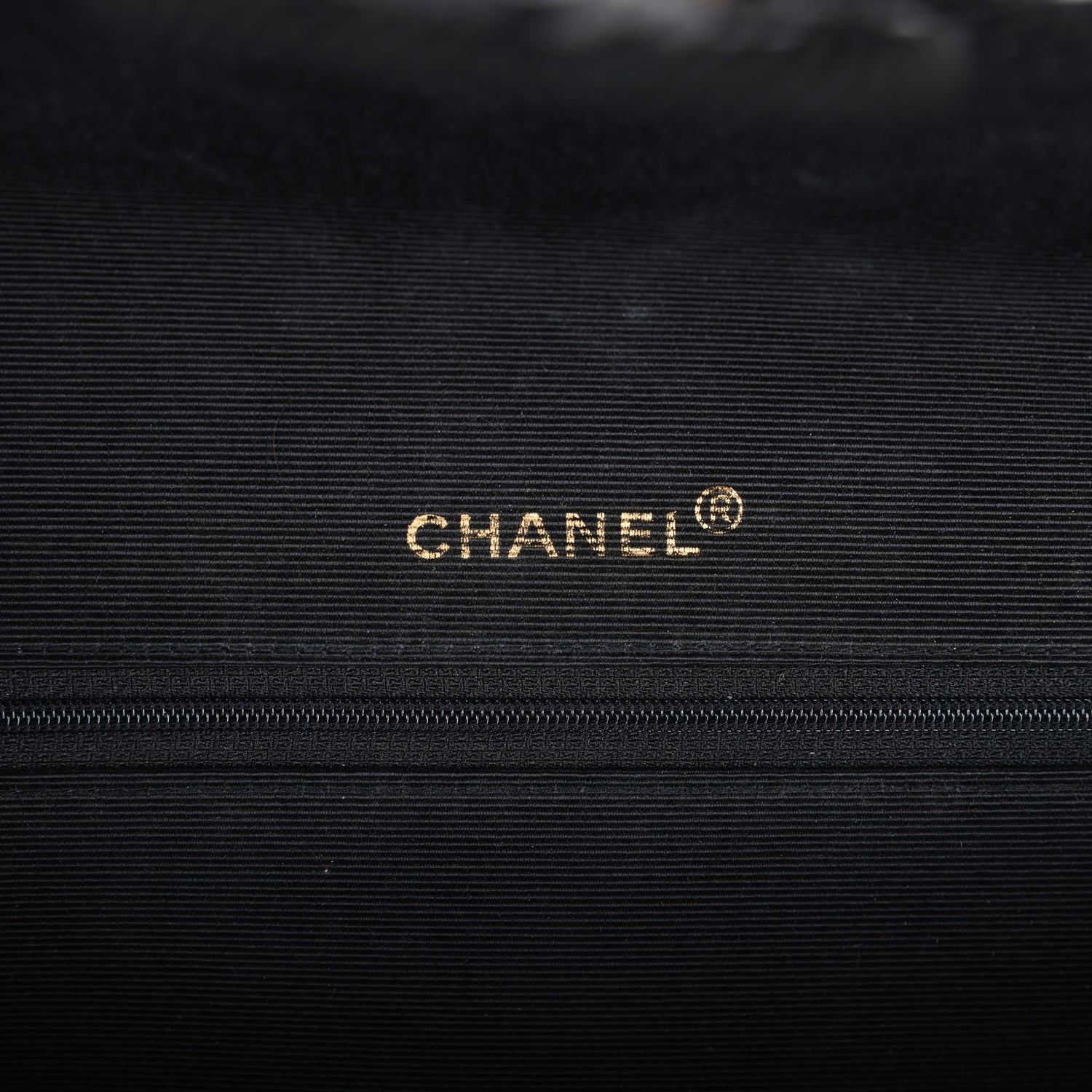 The interior is lined in black fabric and features a zipper pocket with Chanel pull on the back wall.