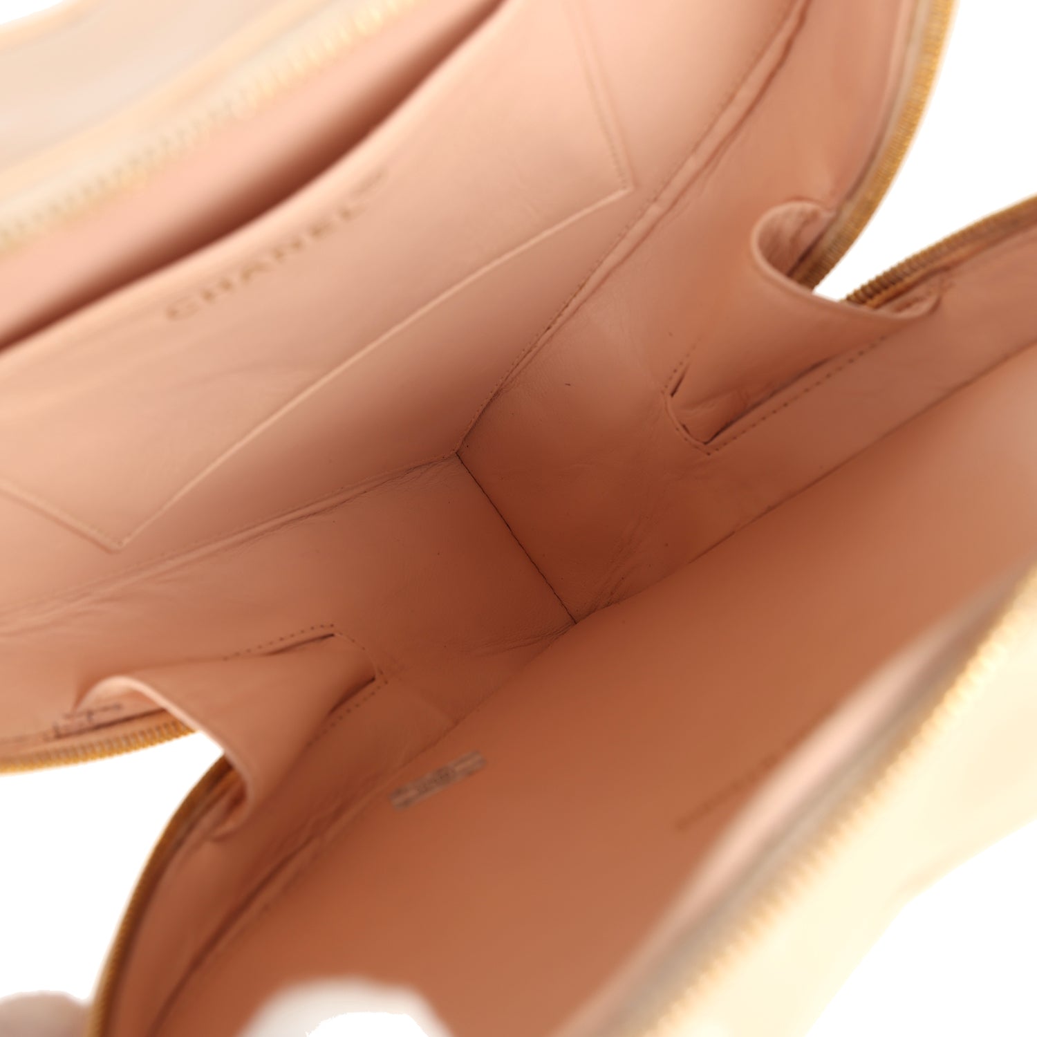 This vintage Heart Vanity Bag is in beige and black quilted patent leather with antique gold hardware, featuring a black patent leather stitched CC logo on front, zipper closure, and an interwoven white patent leather and antique gold top handle.