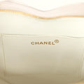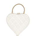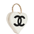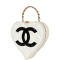 This vintage Heart Vanity Bag is in white and black quilted patent leather with antique gold hardware, featuring a black patent leather stitched CC logo on front, zipper closure, and an interwoven white patent leather and antique gold top handle.