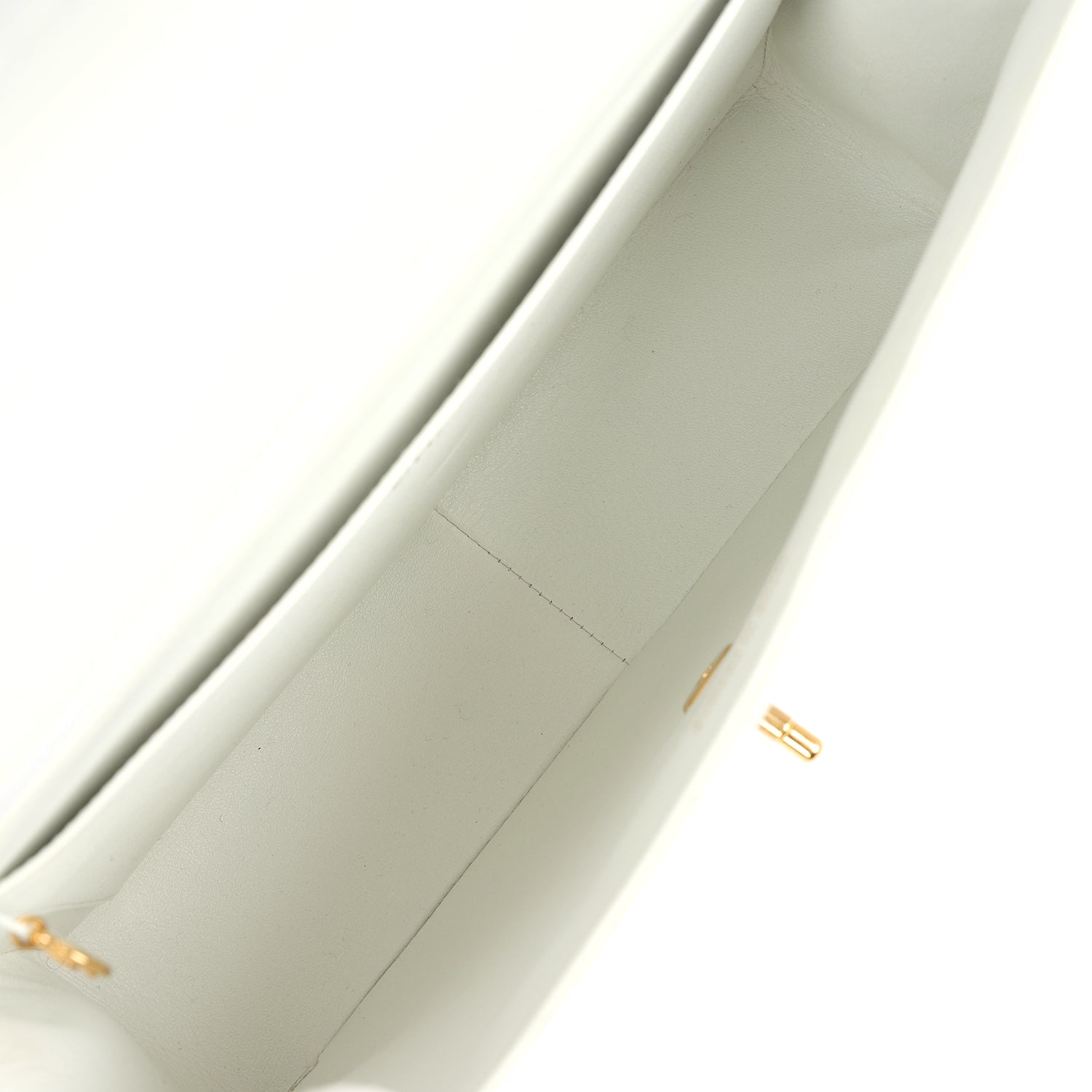 The interior is lined in white leather and has one zip pocket with a CC pull and a slip pocket underneath.