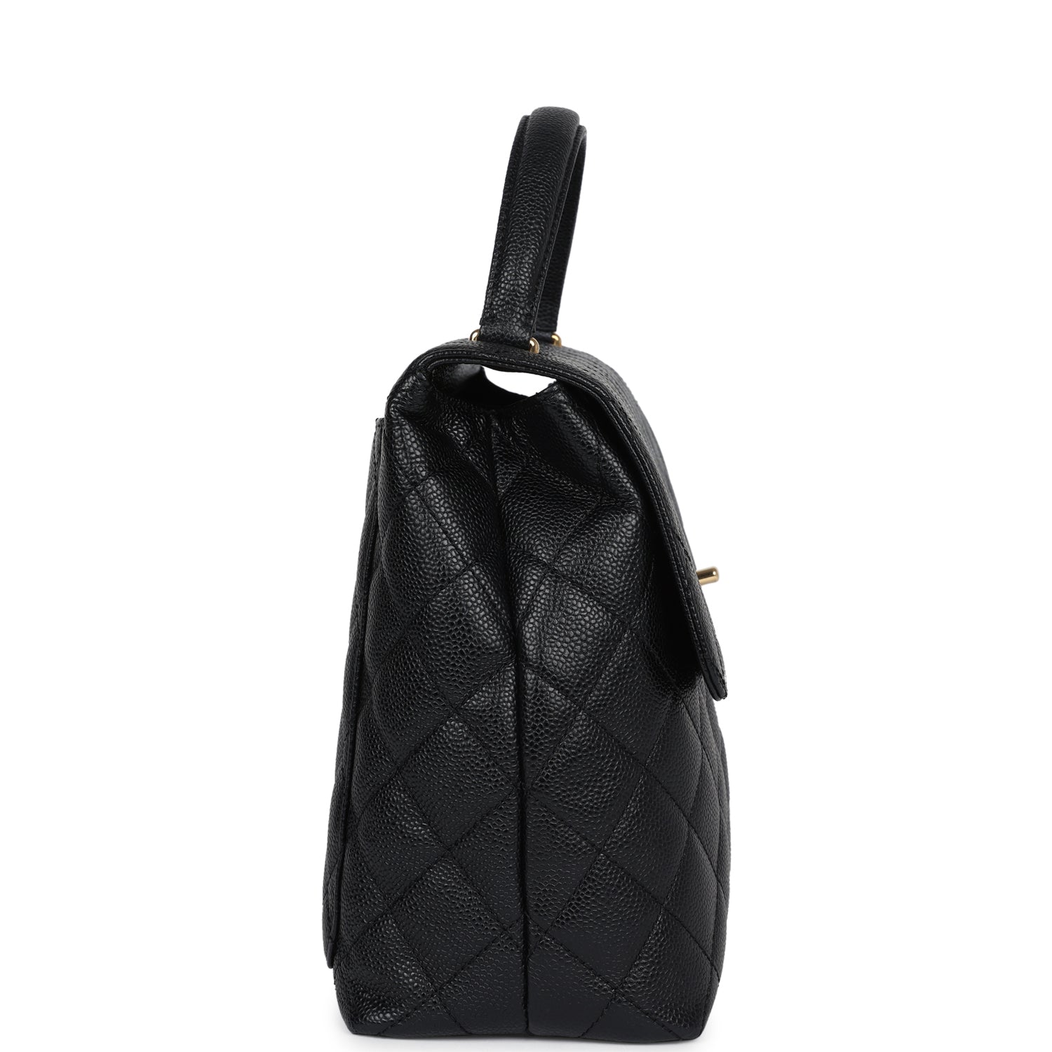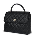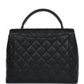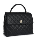 This vintage Chanel Kelly top handle flap bag is in black caviar leather with gold hardware, features the signature CC turnlock closure with front flap, half moon back pocket and a black rolled top handle.
