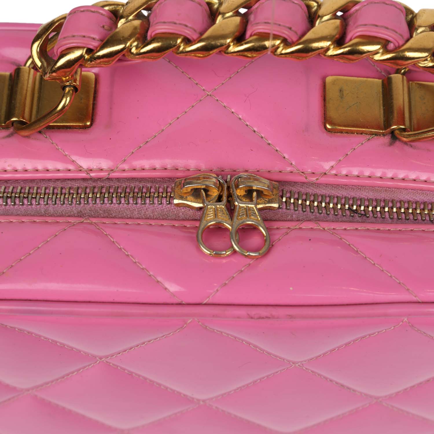 This vintage Vanity Case Bag is in pink quilted patent leather with gold hardware, a zip around closure, an interwoven leather and gold plated chain link top handle, and a detachable interwoven leather and gold plated chain link shoulder strap.