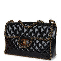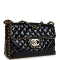 This Vintage Chanel Maxi Chain Around Single Flap Bag is in back patent leather with gold hardware and features a signature CC turnlock closure, half moon back pocket, all over wrap around interwoven black patent leather and gold chain detail, and interwoven black patent leather and gold hardware shoulder/crossbody strap.