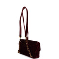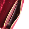 The interior is lined in burgundy leather and has one zip pocket on the rear wall with logo pull, inside one slit pocket.