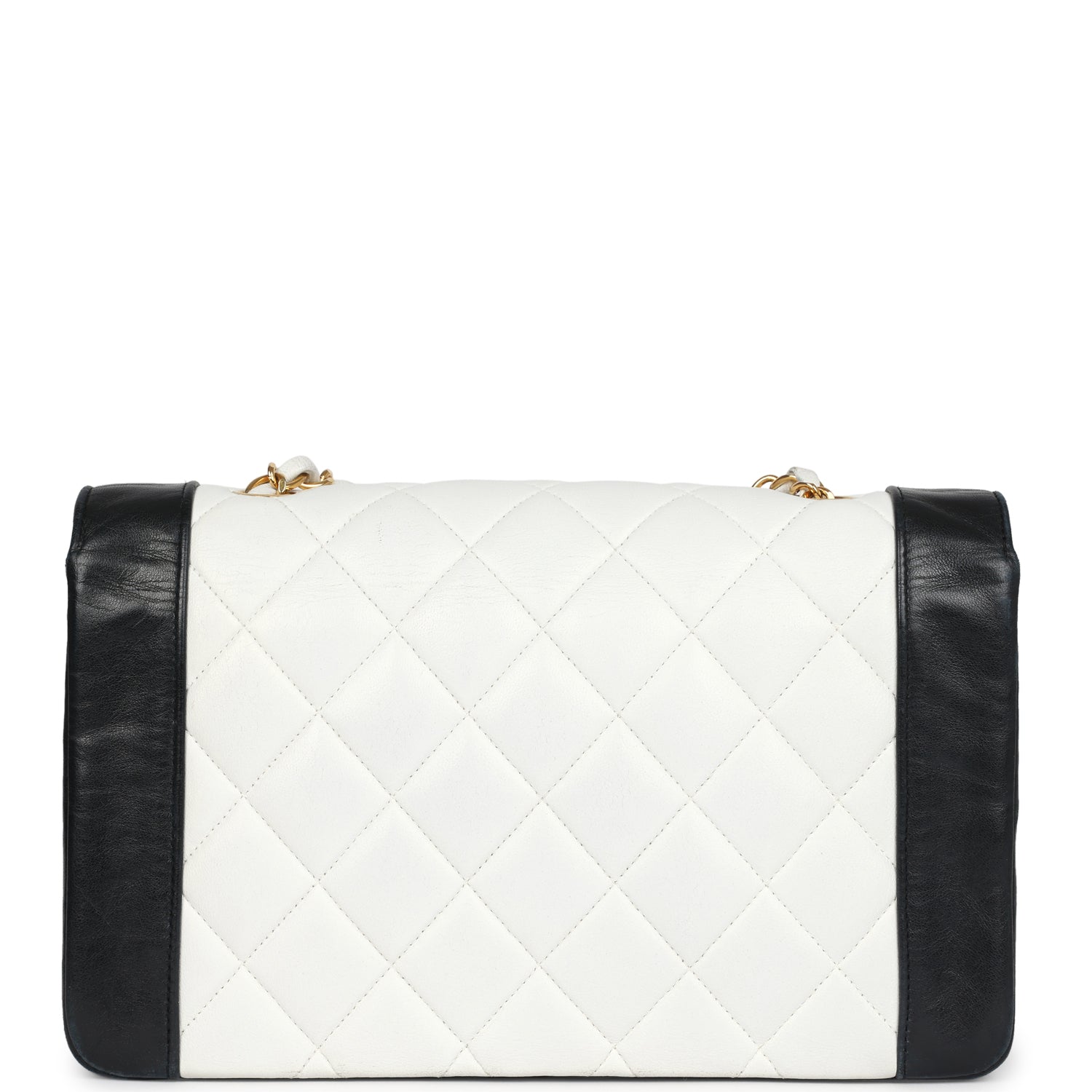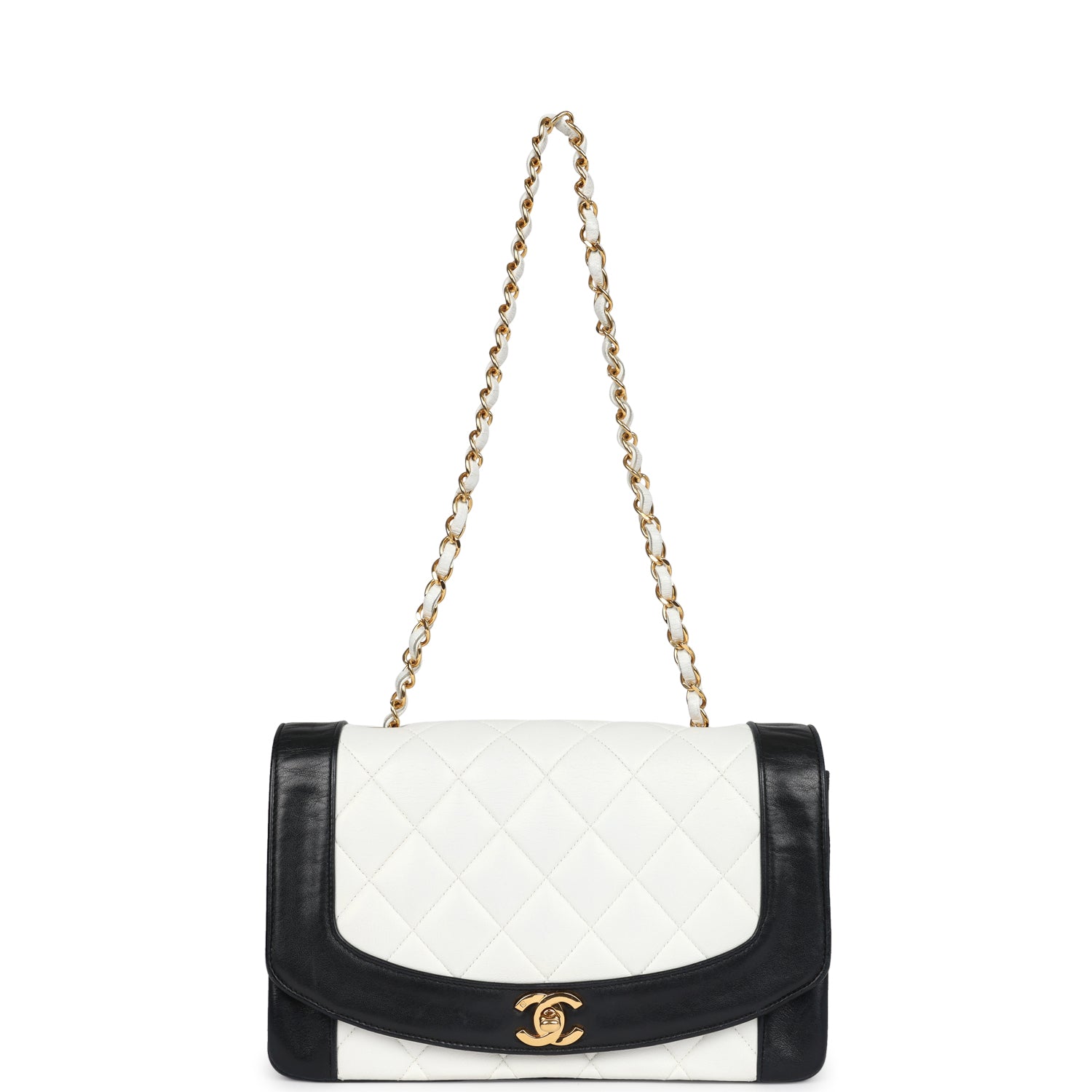 This vintage Medium Diana flap bag is in white and back lambskin leather with gold hardware, featuring a front flap with CC turnlock closure, and adjustable interwoven gold plated chain link and white leather shoulder/crossbody strap.