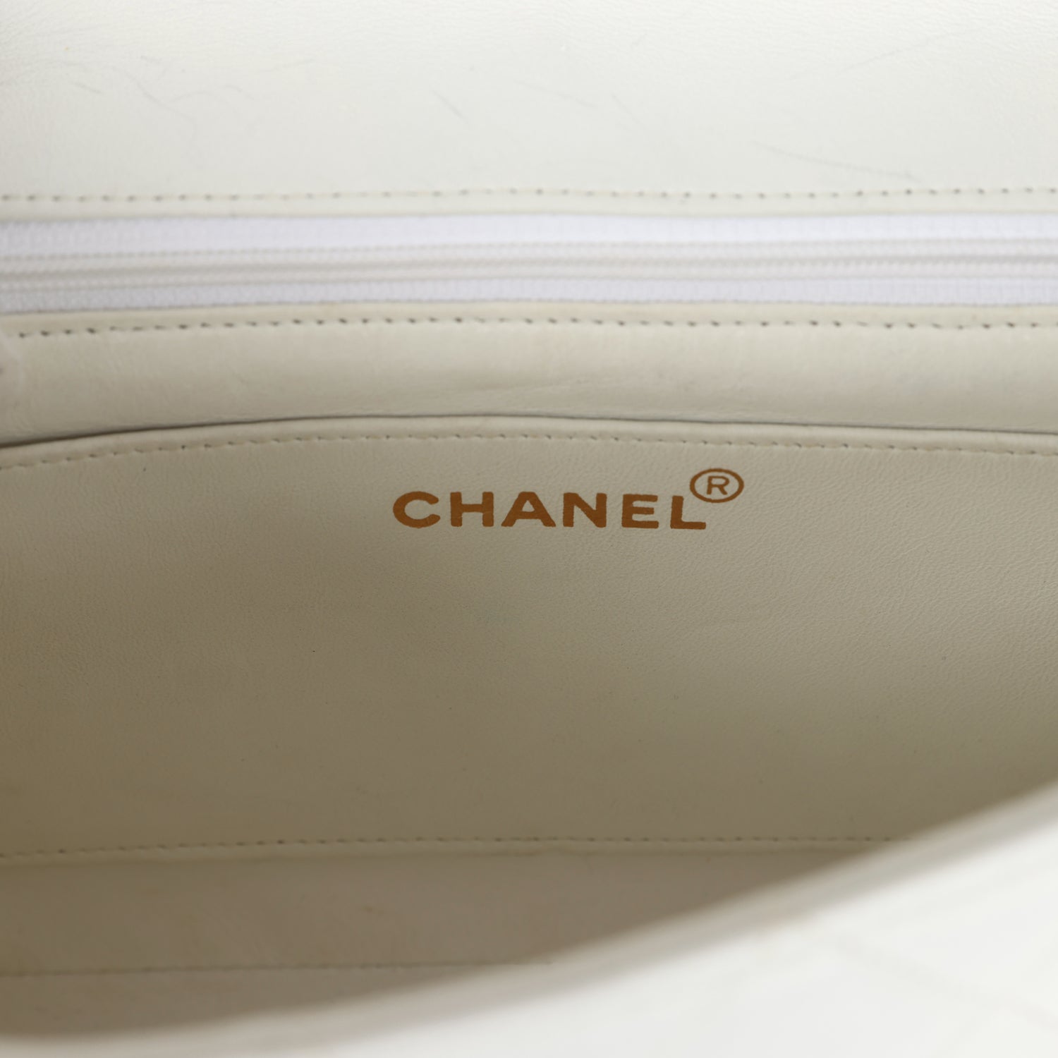 The interior is lined in white leather and includes one zip pocket and one slip pocket on the back wall.