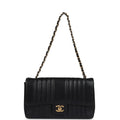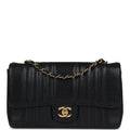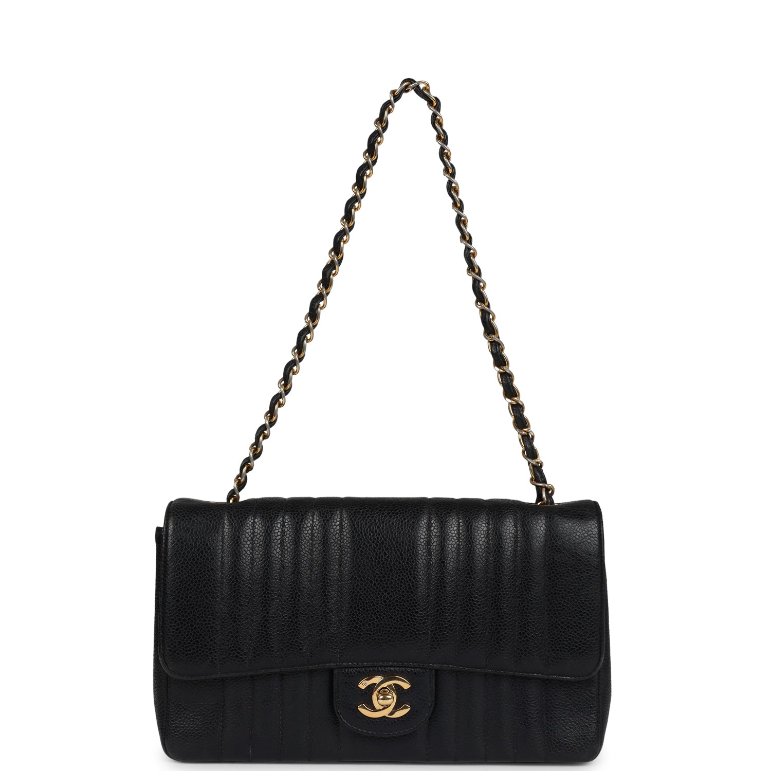 This vintage Chanel Medium Vertical Stripe Flap Bag is in black caviar leather with gold hardware, featuring vertical front and back quilting, front flap with CC turnlock closure, tonal stitching, slit pocket on exterior and a single interwoven adjustable gold chainlink and black shoulder/crossbody strap.