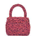 This vintage Micro Kelly Flap Bag is in pink tweed boucle with gold hardware, a front flap with signature CC turnlock, a rear half moon pocket, and a single rolled top handle.