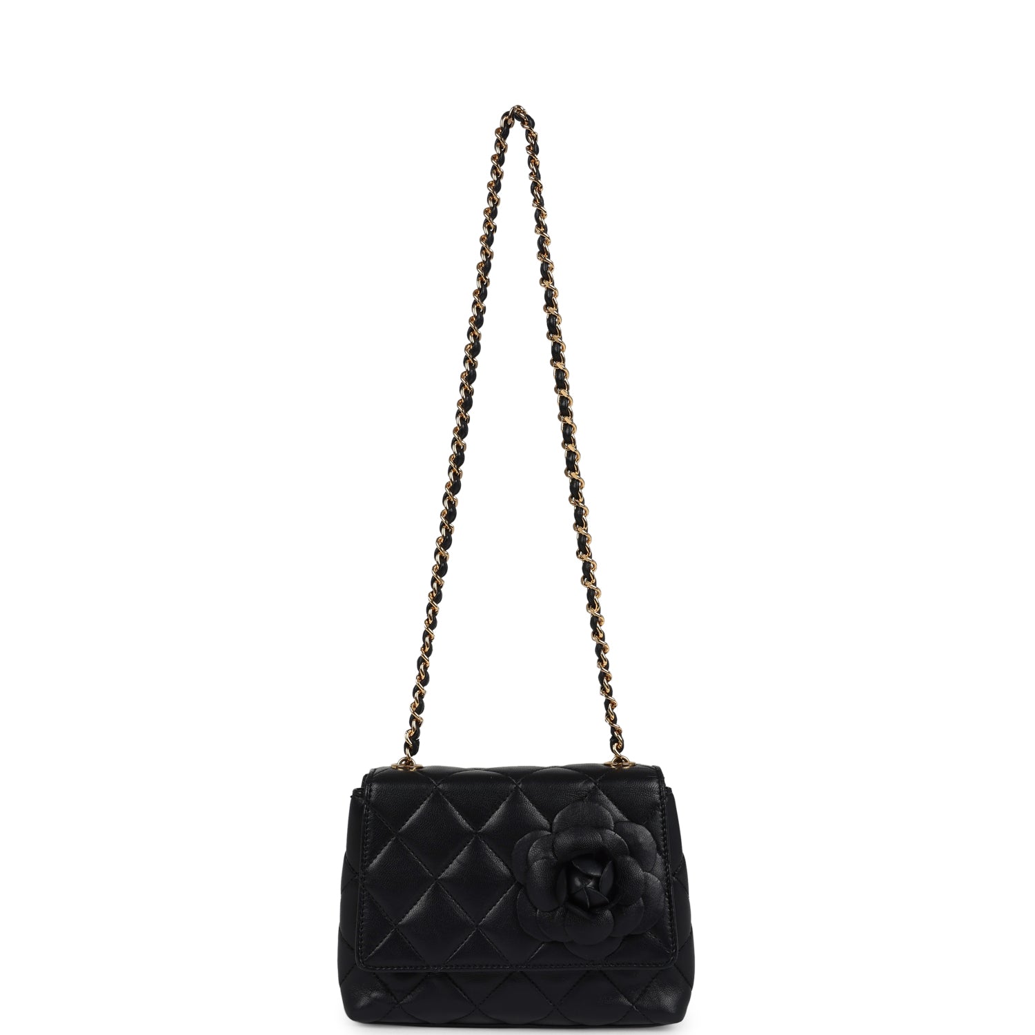 This vintage Mini Camellia Flap Bag is of black lambskin with gold tone hardware, featuring a front flap with snap closure, a black lambskin 3D camellia flower, a quilted CC logo on the base, and a single interwoven black leather and gold tone hardware chainlink shoulder strap.