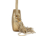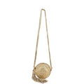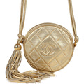 This vintage Chanel Mini CC Round Crossbody Bag is of gold lambskin with gold tone hardware, featuring signature diamond quilt, a quilted CC logo on the front, top zipper closure with tassel zipper pull, and a shoulder strap made of four separate leather straps joined together.