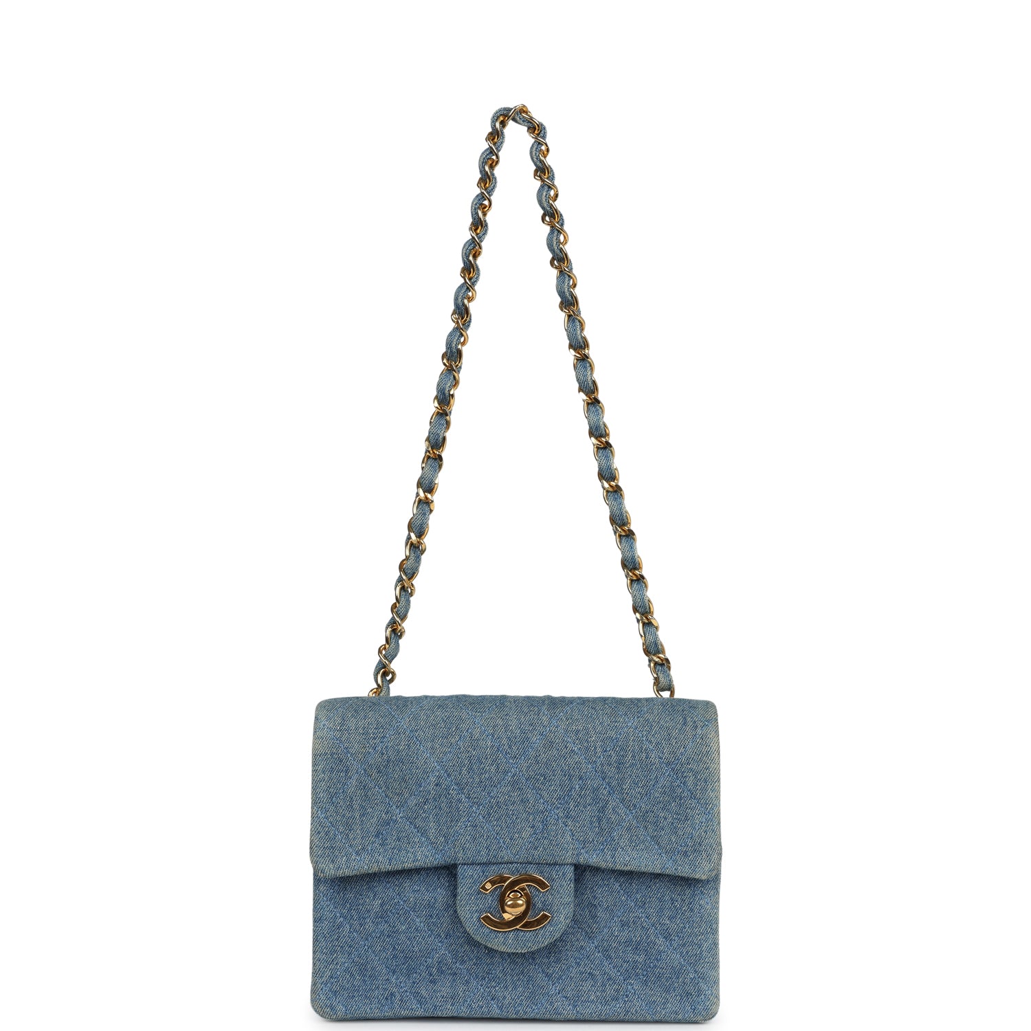 Vintage Chanel Mini Square Flap Bag Blue Denim Gold Hardware