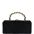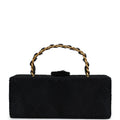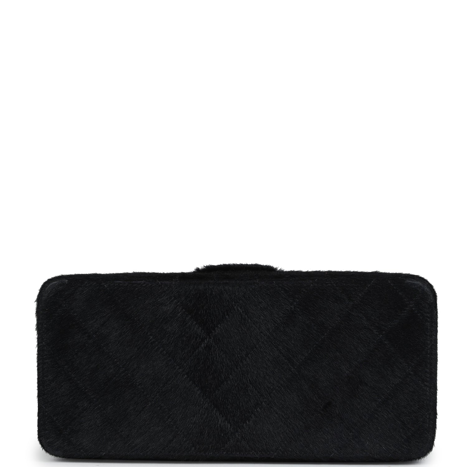 This vintage Rectangular Vanity Box is in black pony hair with antique gold hardware, featuring tonal stitching, black pony hair, a pull tab snap closure and a single interwoven antique gold chainlink and pony hair top handle.