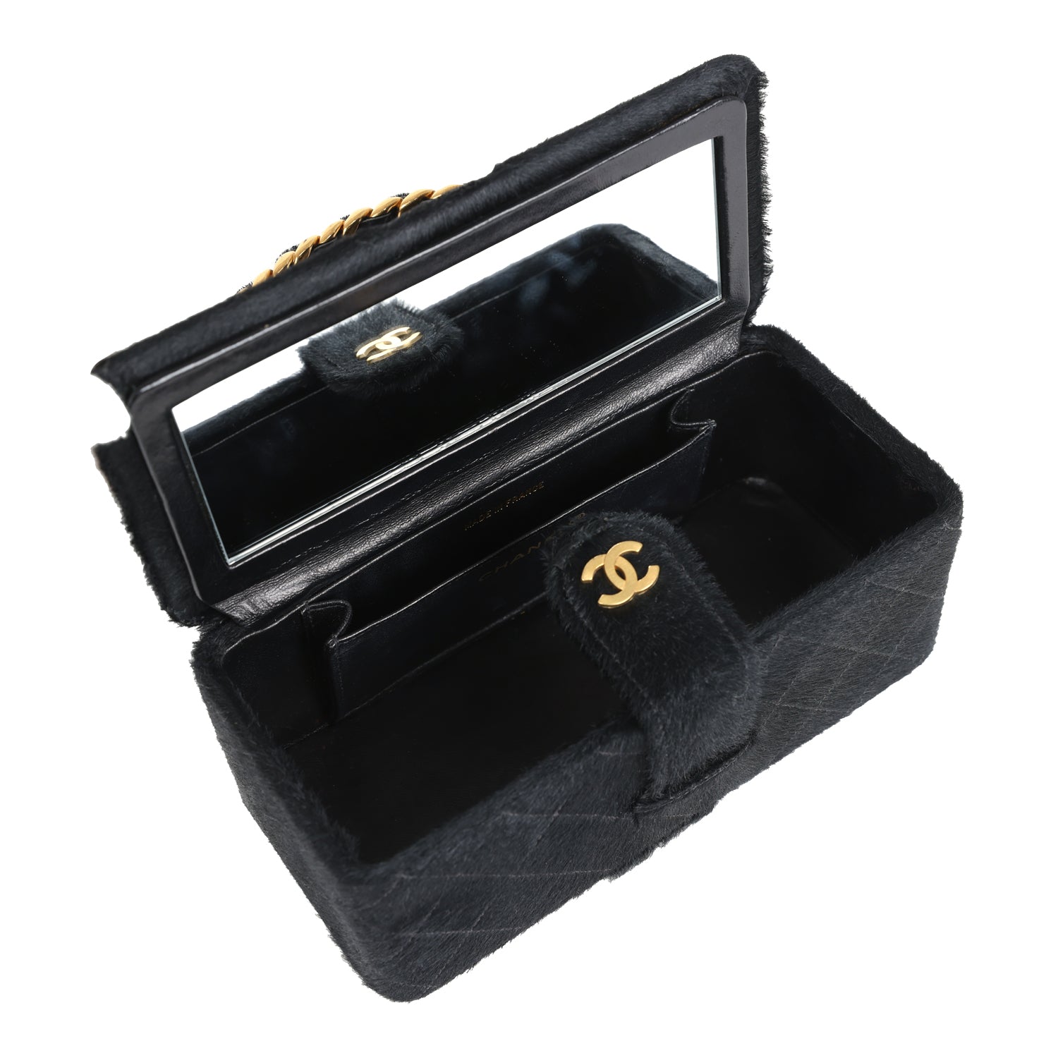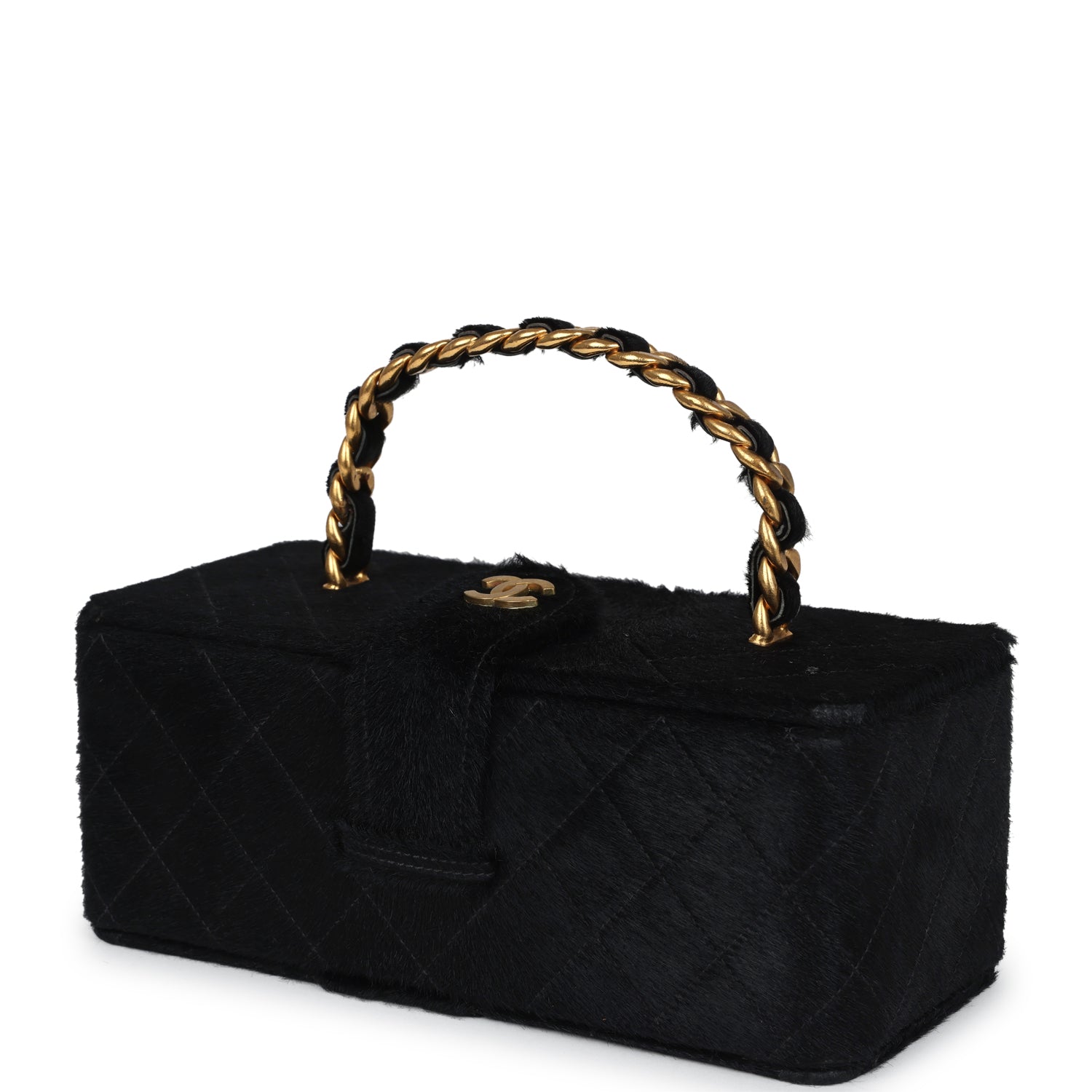 Vintage Chanel Rectangular Vanity Box Black Pony Hair Antique Gold Hardware