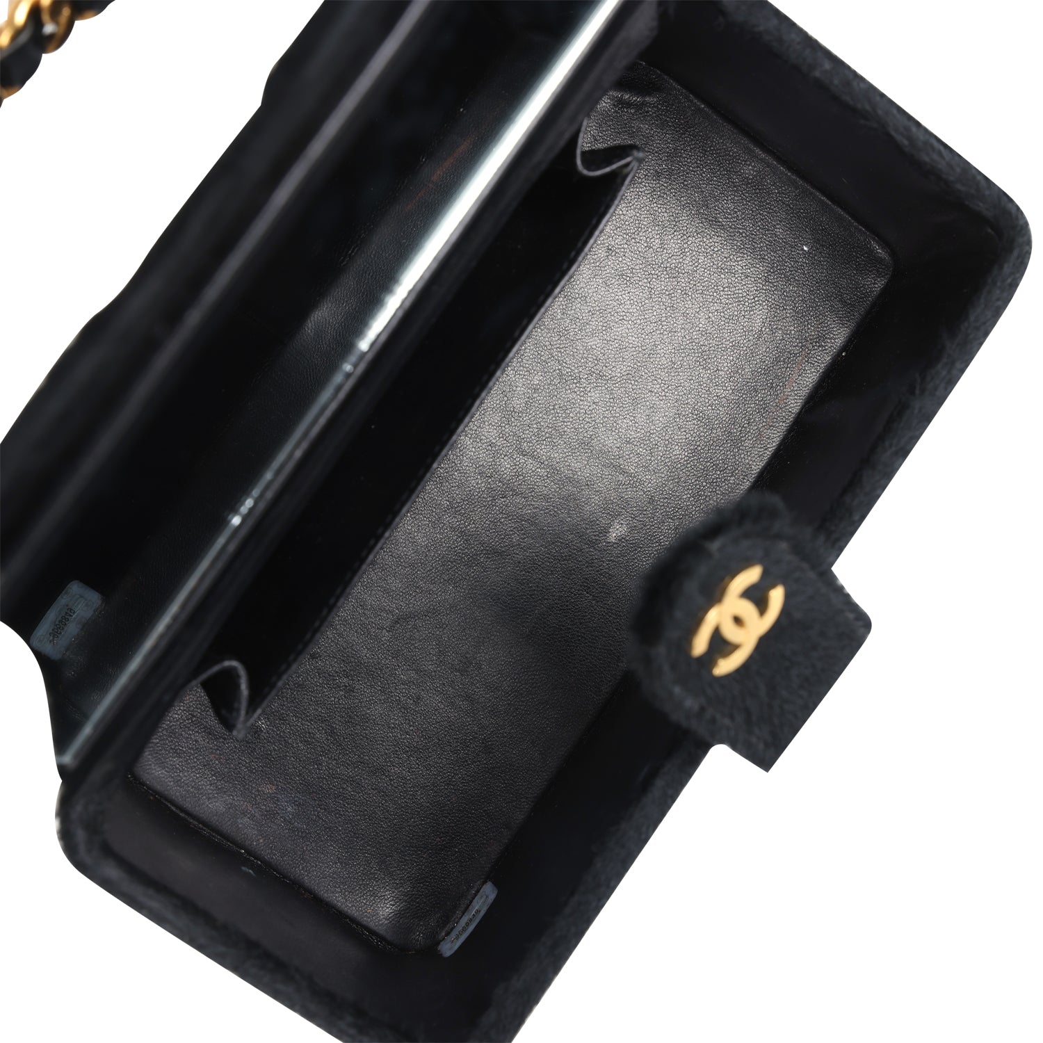 The interior is lined in black leather and has a built-in mirror and one open slip pocket on rear wall.