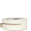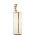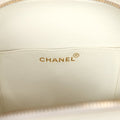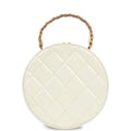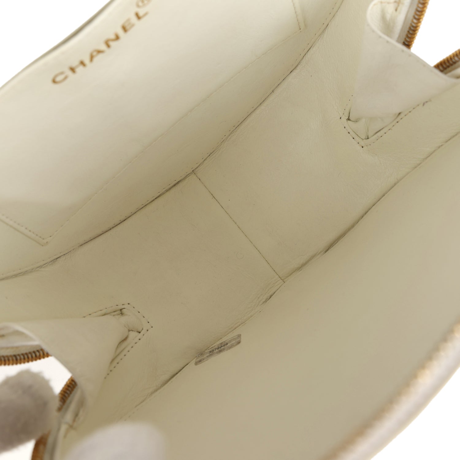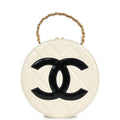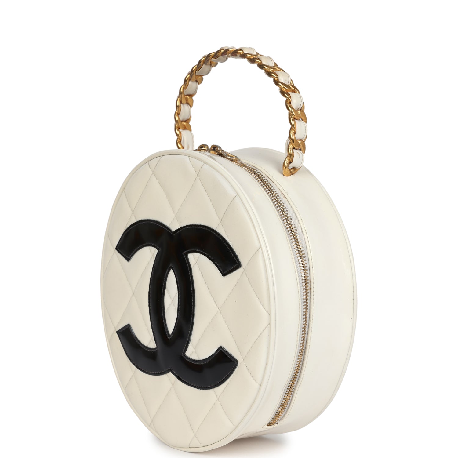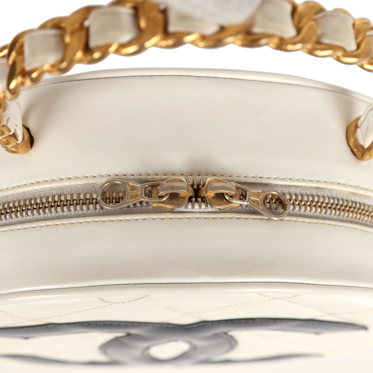 This Vintage Round Vanity Case is in white and black quilted patent leather with antique gold hardware, stitched CC Logo on front, double zipper closure, and interwoven patent leather and antique gold top handle.