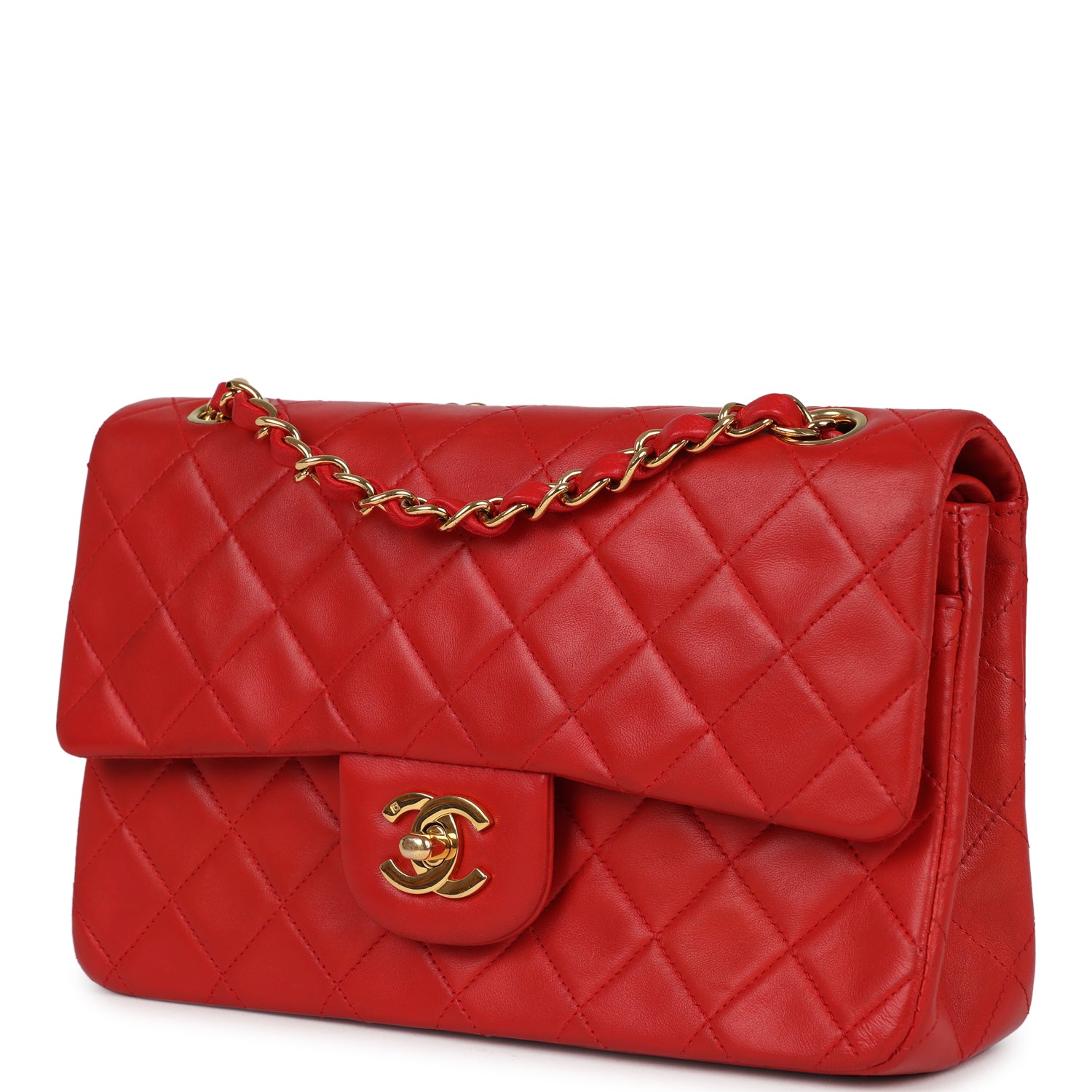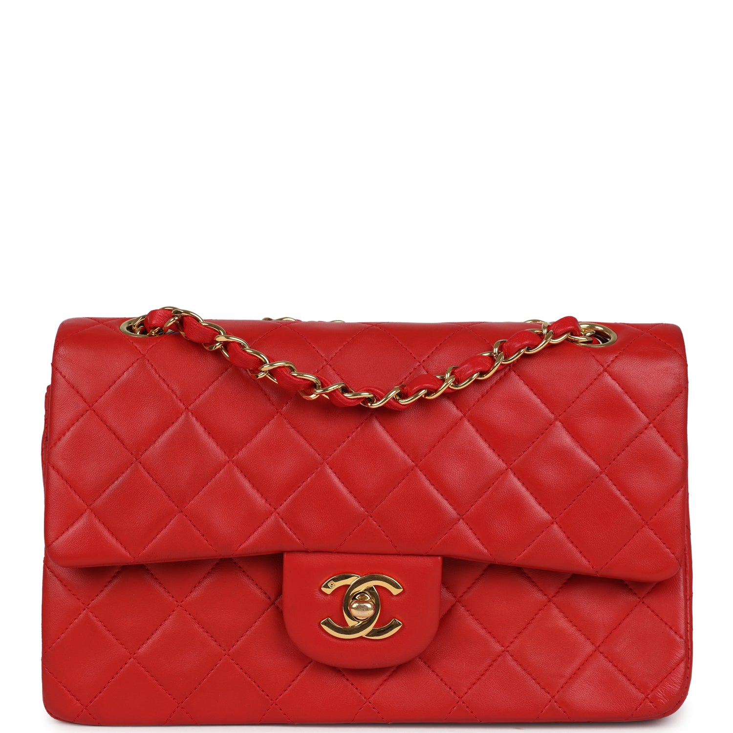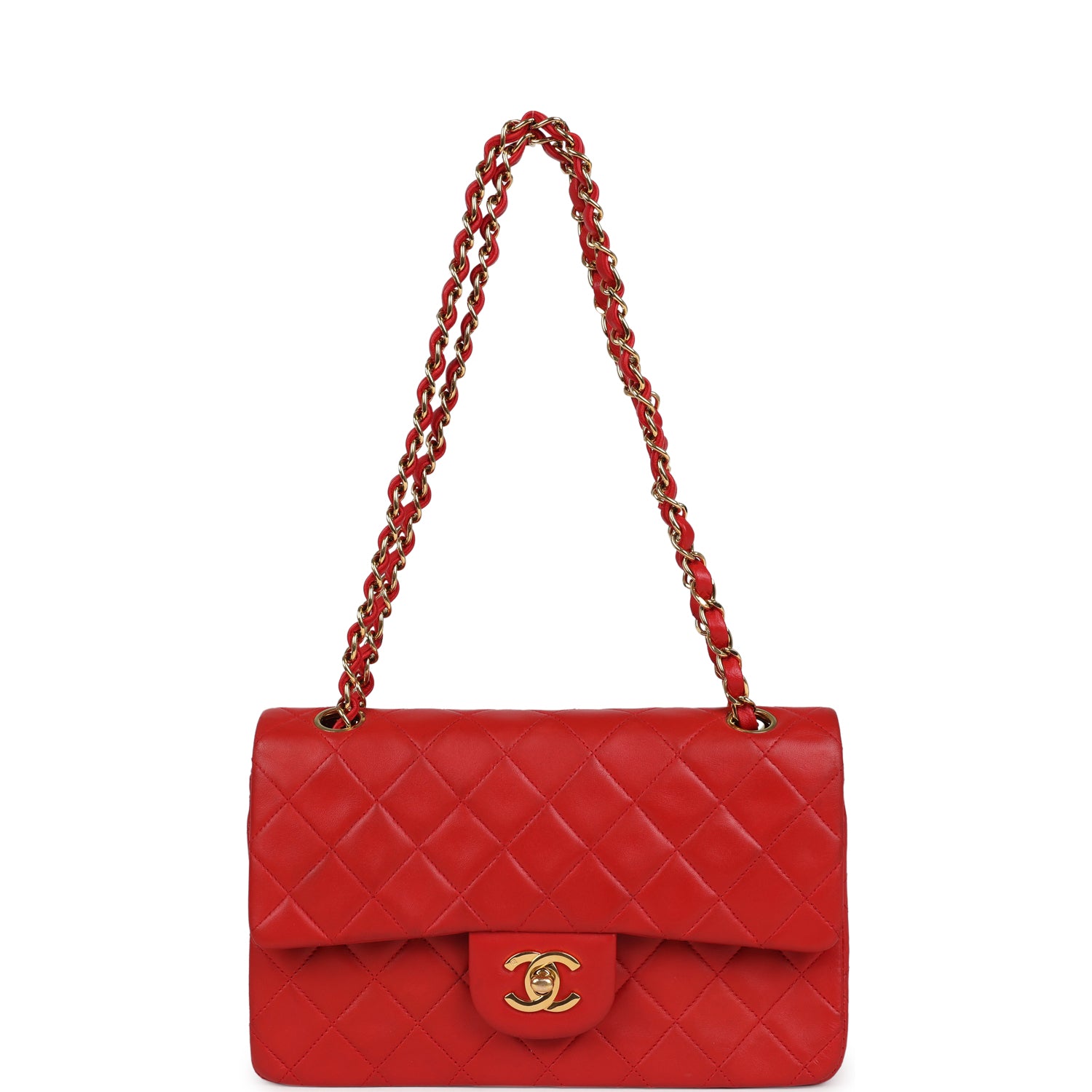 This Small Classic Flap Bag is in red lambskin leather with gold tone hardware and features a front flap with signature CC turnlock closure, half moon back pocket, and adjustable interwoven gold tone chainlink and Red leather shoulder strap.