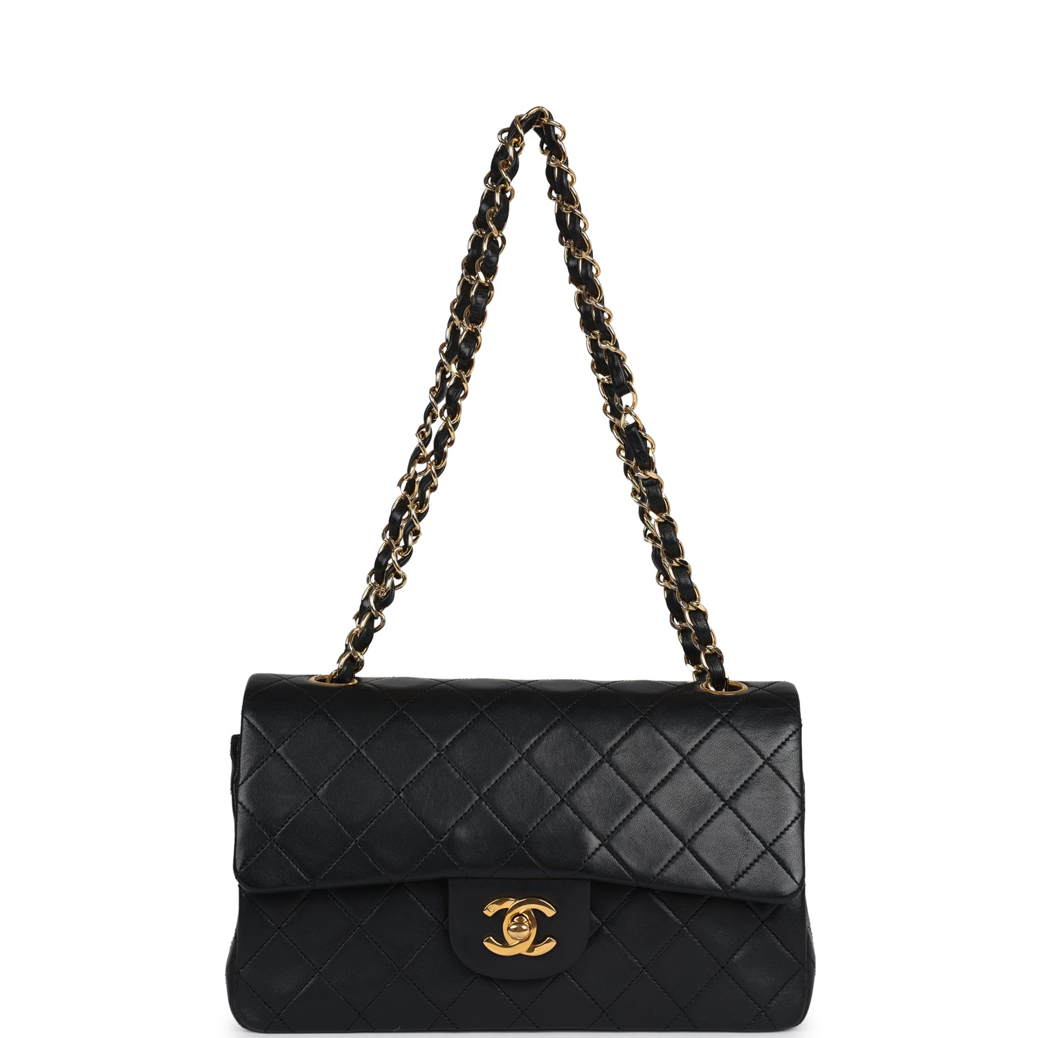This vintage small Classic Double Flap bag is in black lambskin leather with gold tone hardware and features a front flap with signature CC turnlock closure, half moon back pocket, and adjustable interwoven gold tone chain link and black leather shoulder strap.