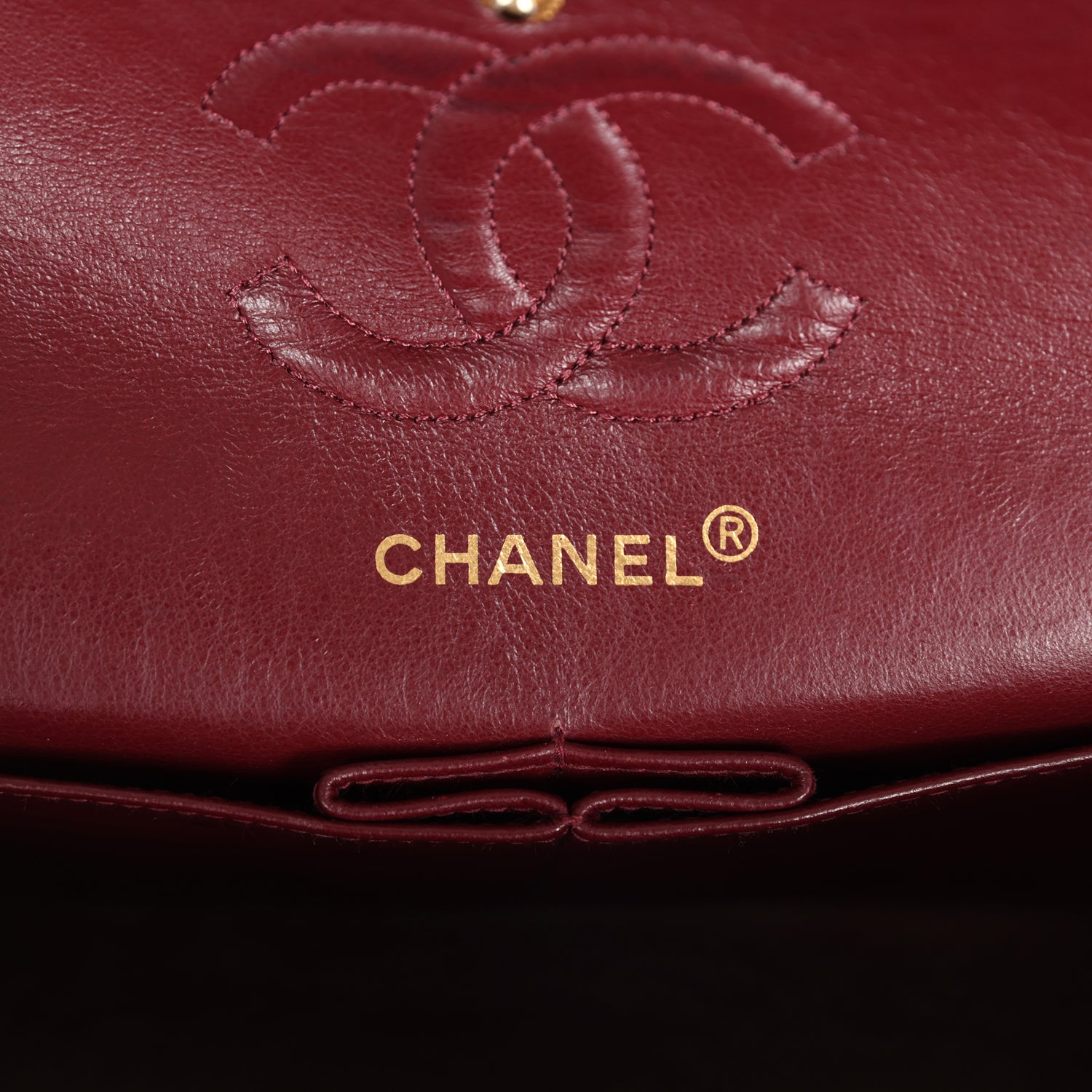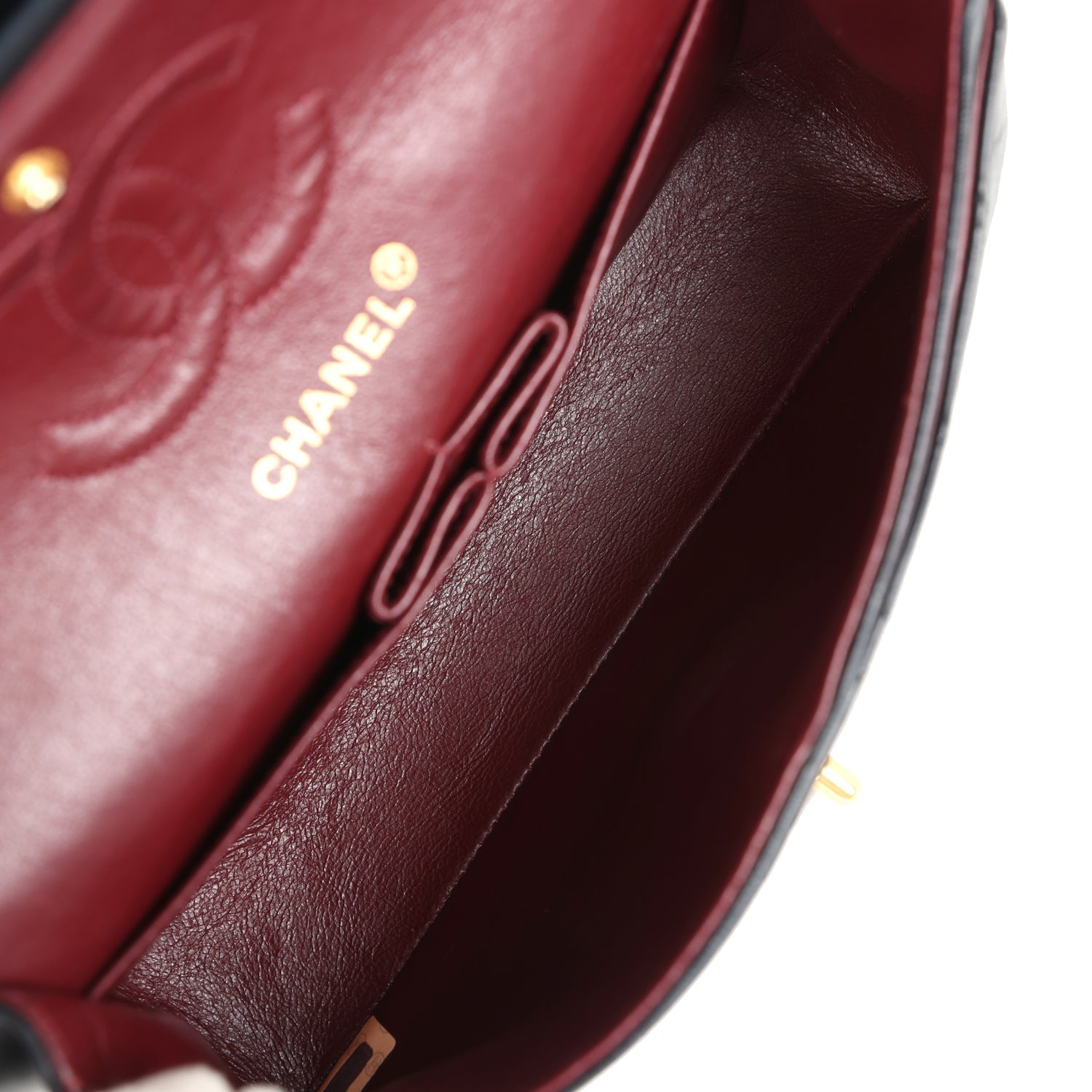 The interior is lined in burgundy leather with the "love letter" zipper compartment underneath the first flap, an "outer" slit pocket under the second flap, and an interior compartment with two open pockets separated by a "lipstick" compartment.