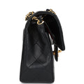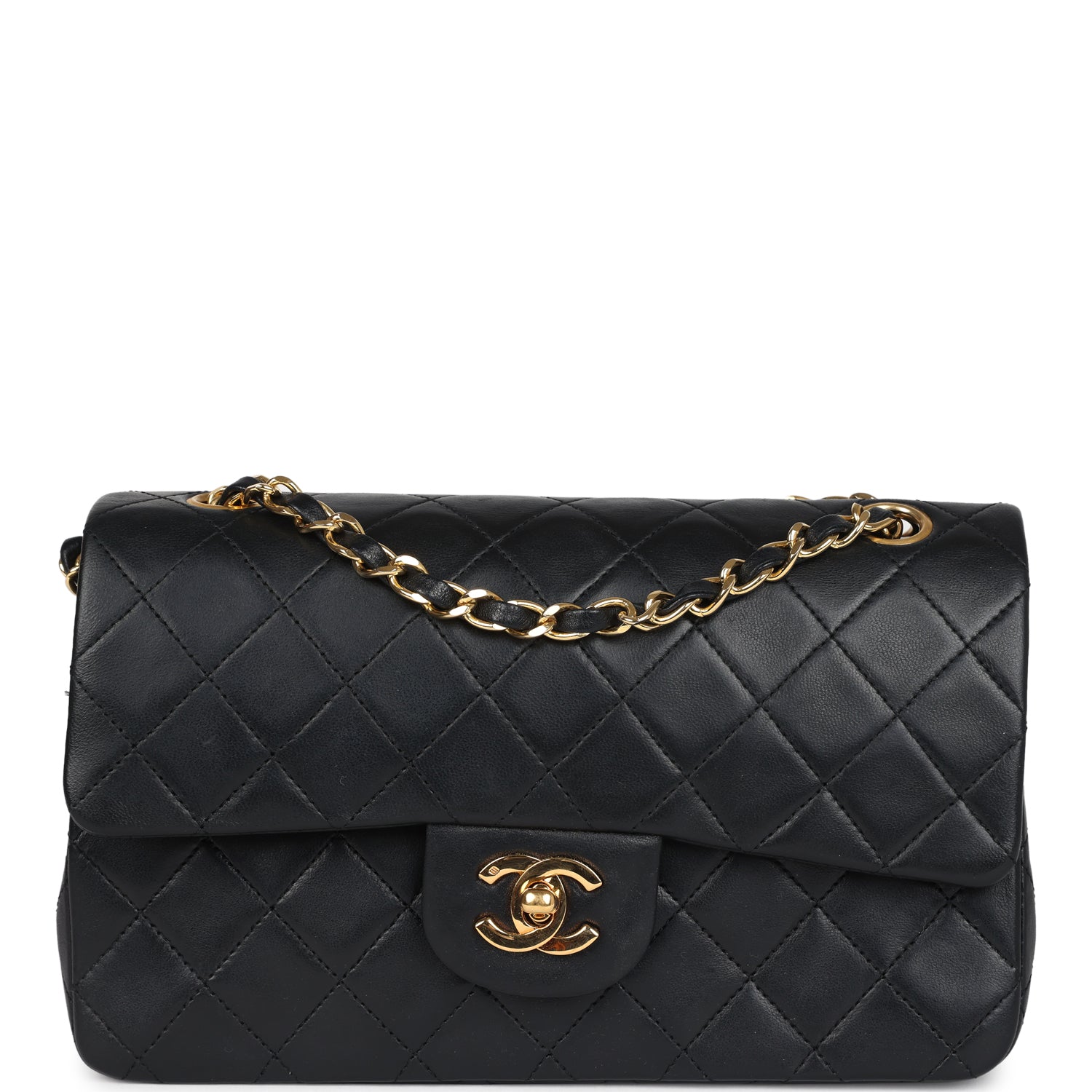 This vintage small Classic Double Flap bag is in black lambskin leather with gold plated hardware and features a front flap with signature CC turnlock closure, half moon back pocket, and adjustable interwoven gold chain link and black leather shoulder strap.