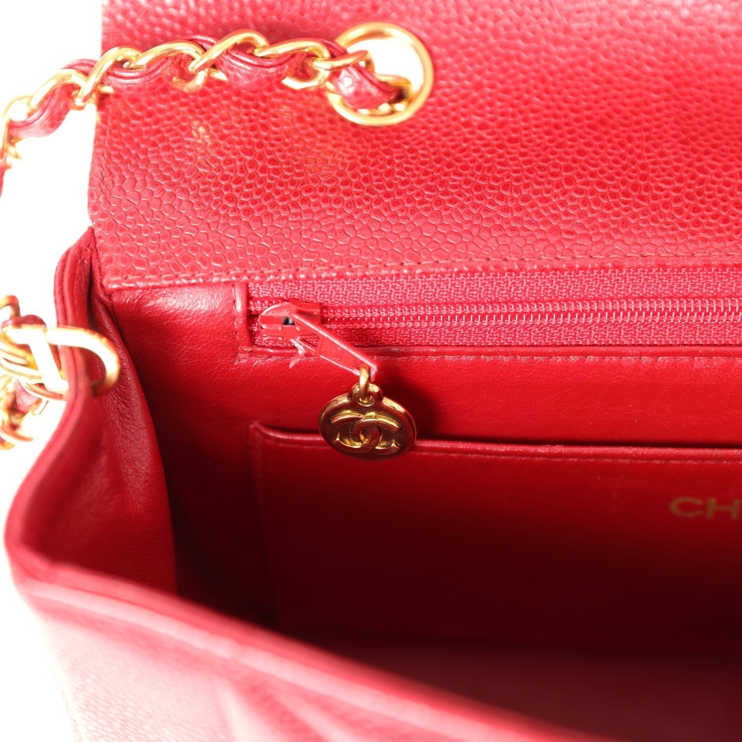 vintage Diana flap bag is in red caviar leather with gold hardware, featuring a front flap with classic gold plated CC turnlock closure and red leather and gold chain link shoulder/crossbody strap.