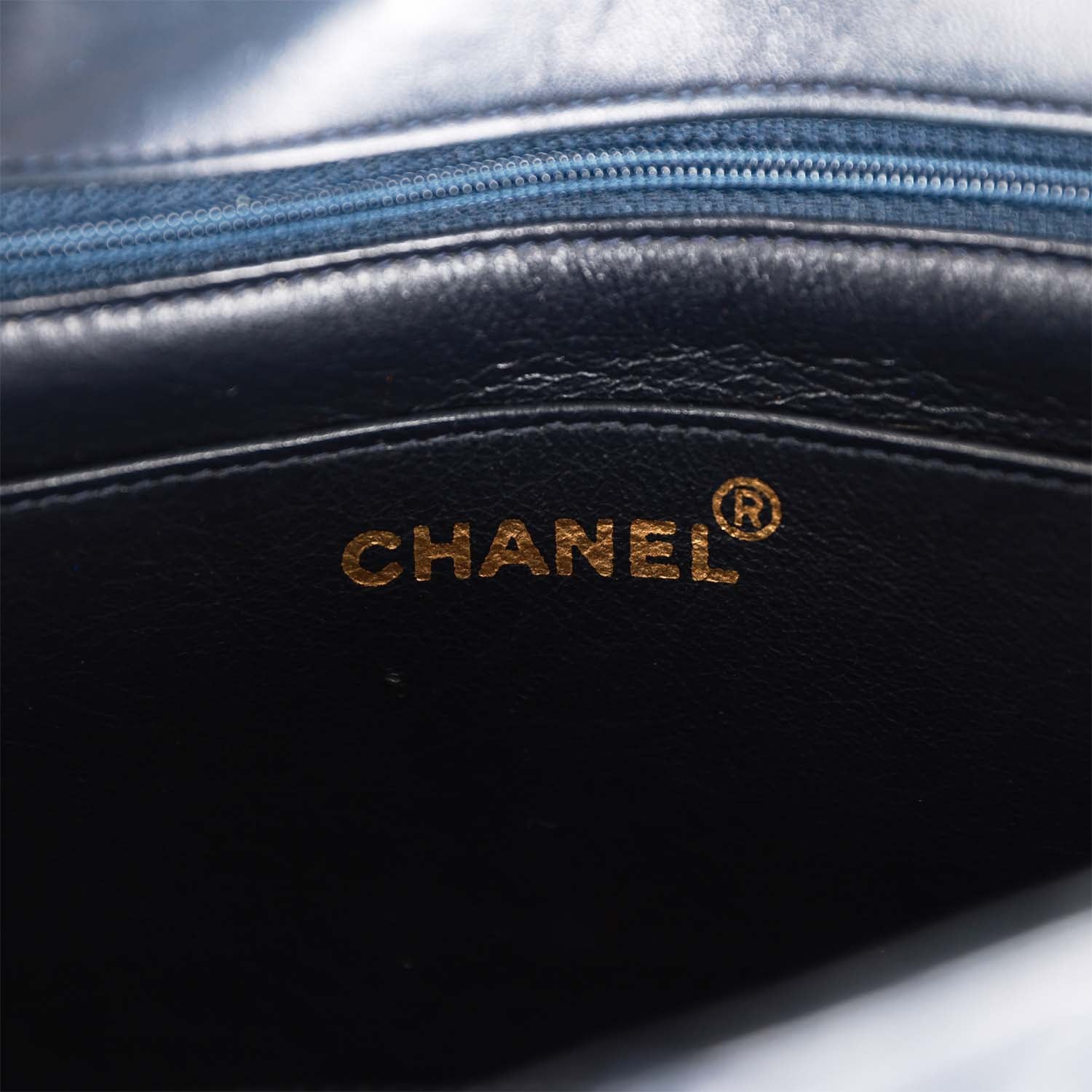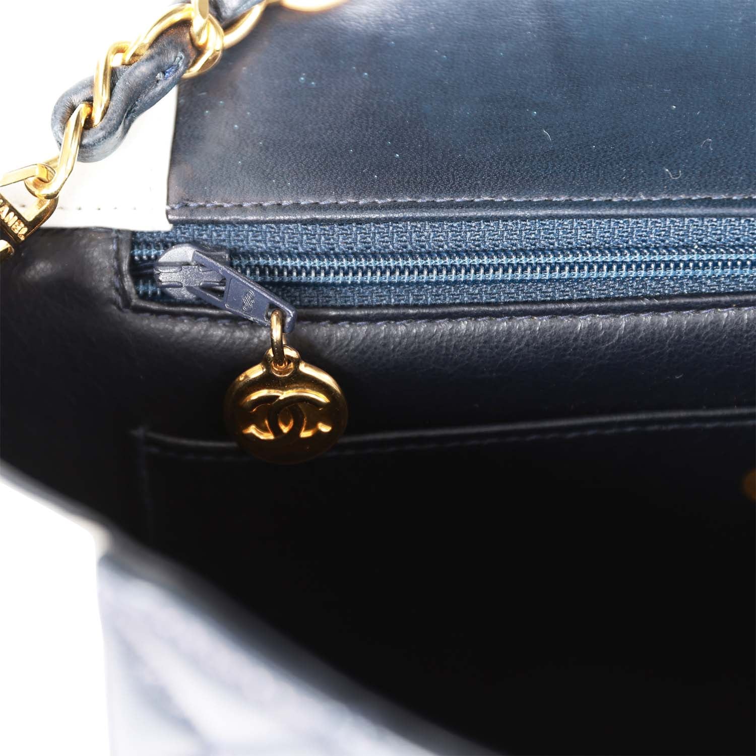 This Vintage Small Diana flap bag is in navy and white lambskin leather with gold plated hardware, front flap with CC turnlock closure, and interwoven gold plated chain link and navy leather shoulder/crossbody strap