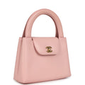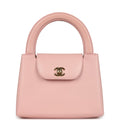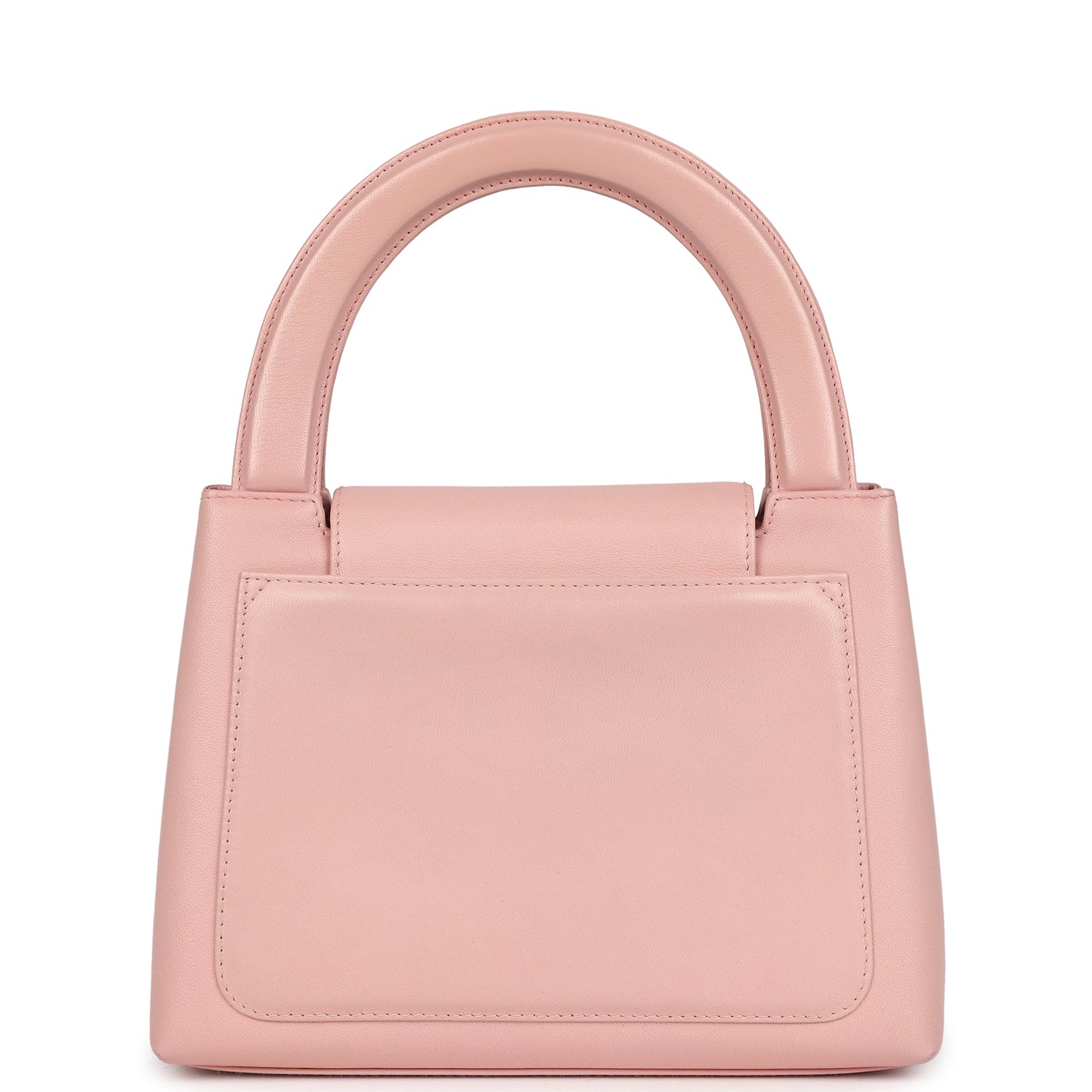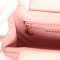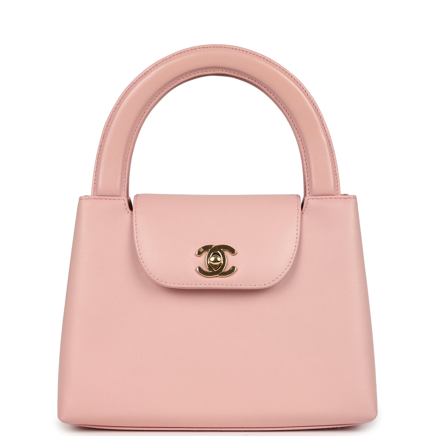 This vintage Chanel Small Top Handle Kelly is in pink lambskin leather with gold hardware, featuring tonal stitching, has a front tab with CC turnlock closure, back exterior pocket and two flat top handles.