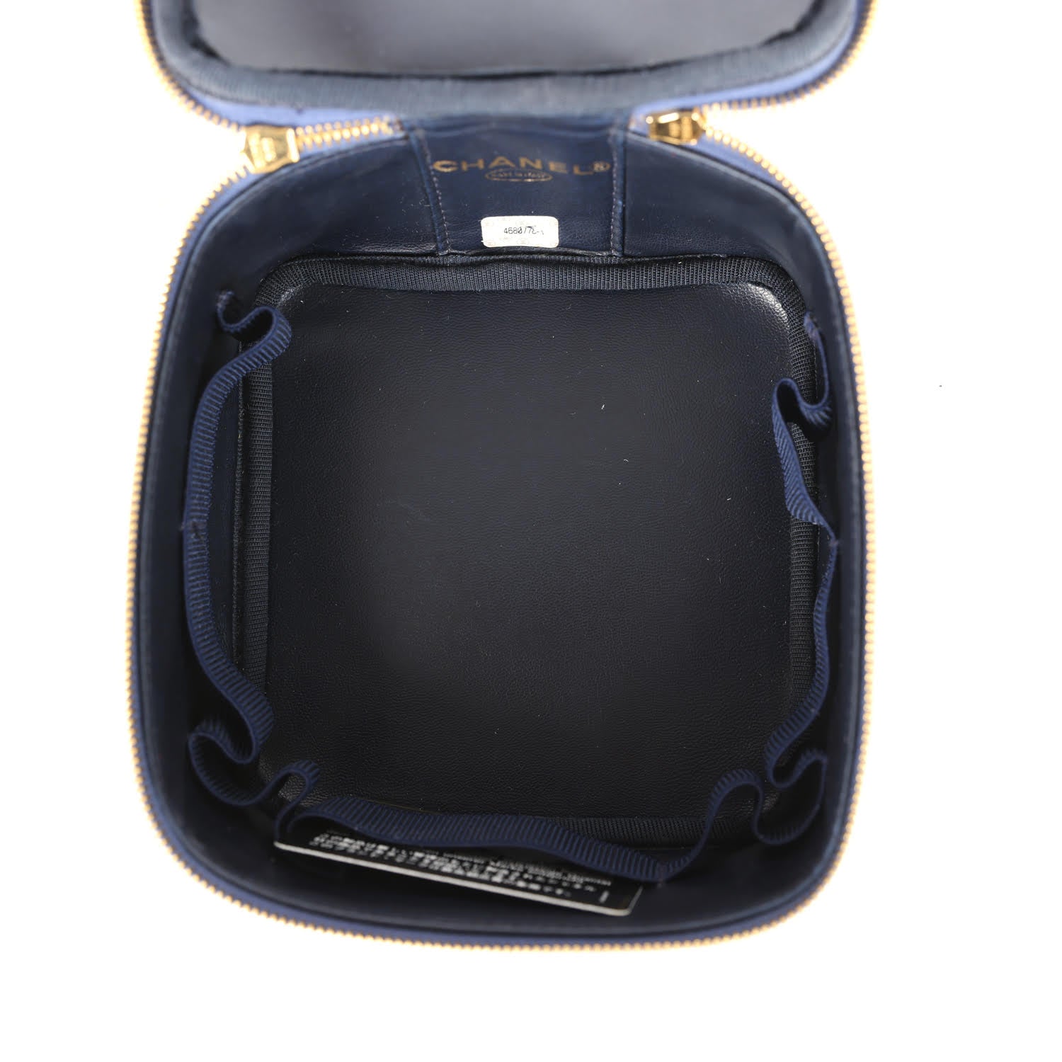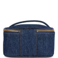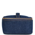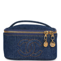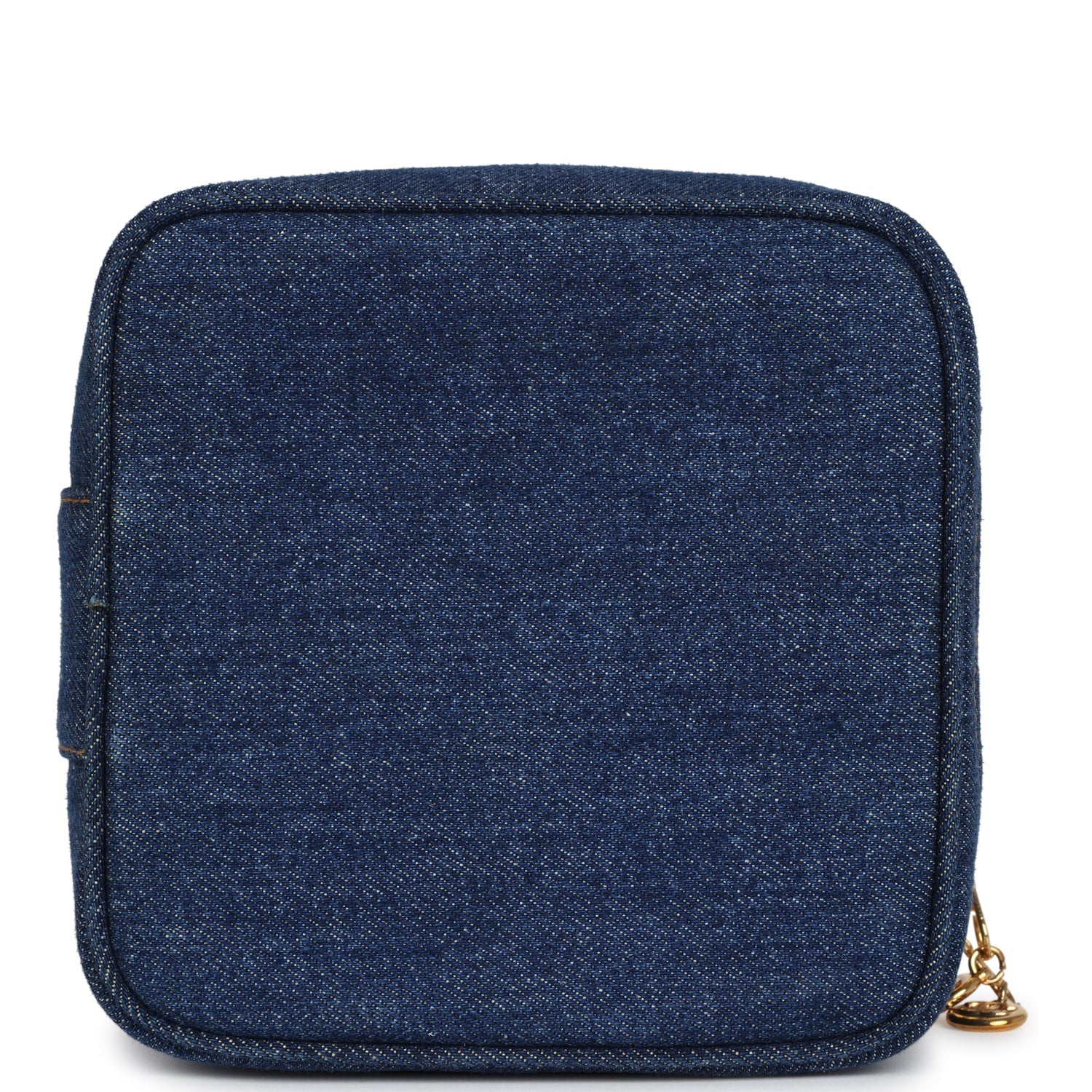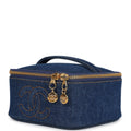 This Vintage Square Vanity Case is in dark blue denim with gold hardware, featuring contrast stitching, contrast stitched CC logo on the front, a double zip-around zipper, and a small top handle.