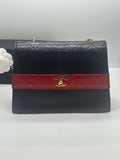 Materials & Colour: Crafted in supple lambskin leather, this trapezoidal flap bag features an elegant bi?colour palette of deep navy and vibrant red. Quilted finish adding subtle texture.