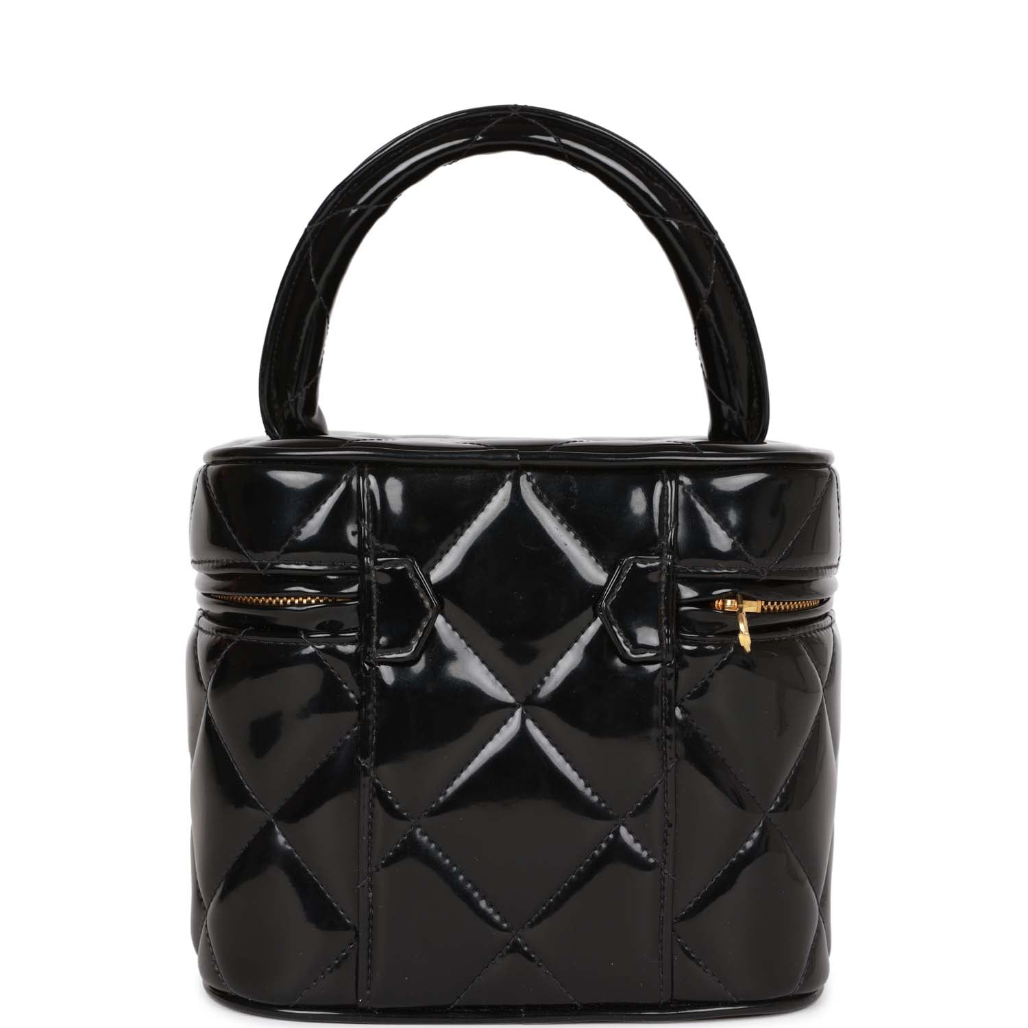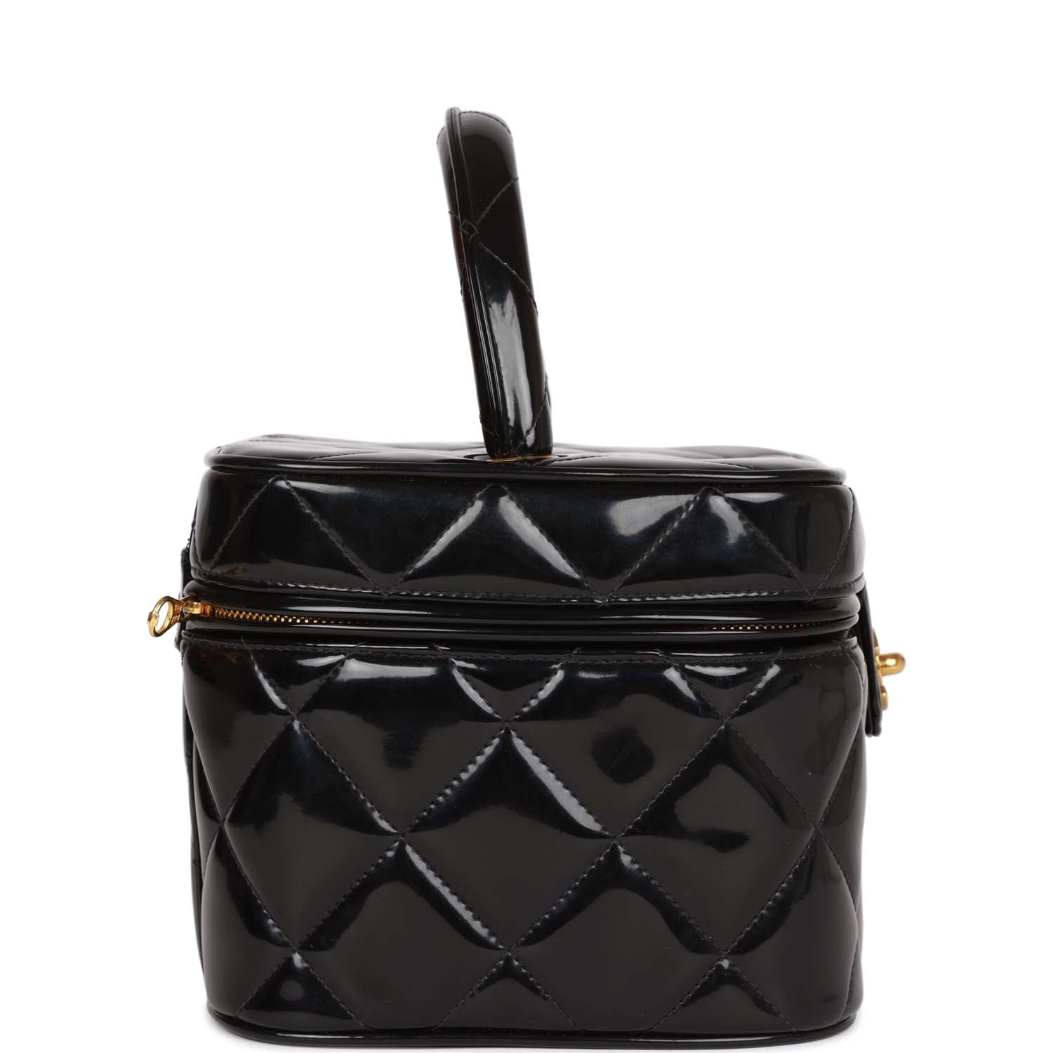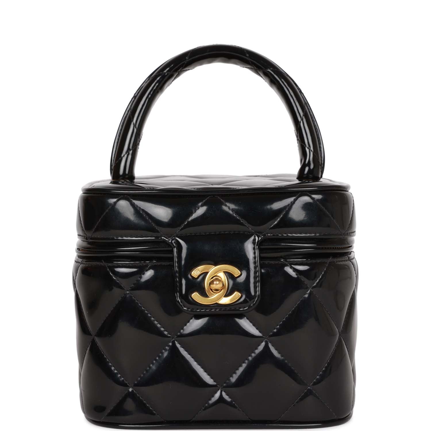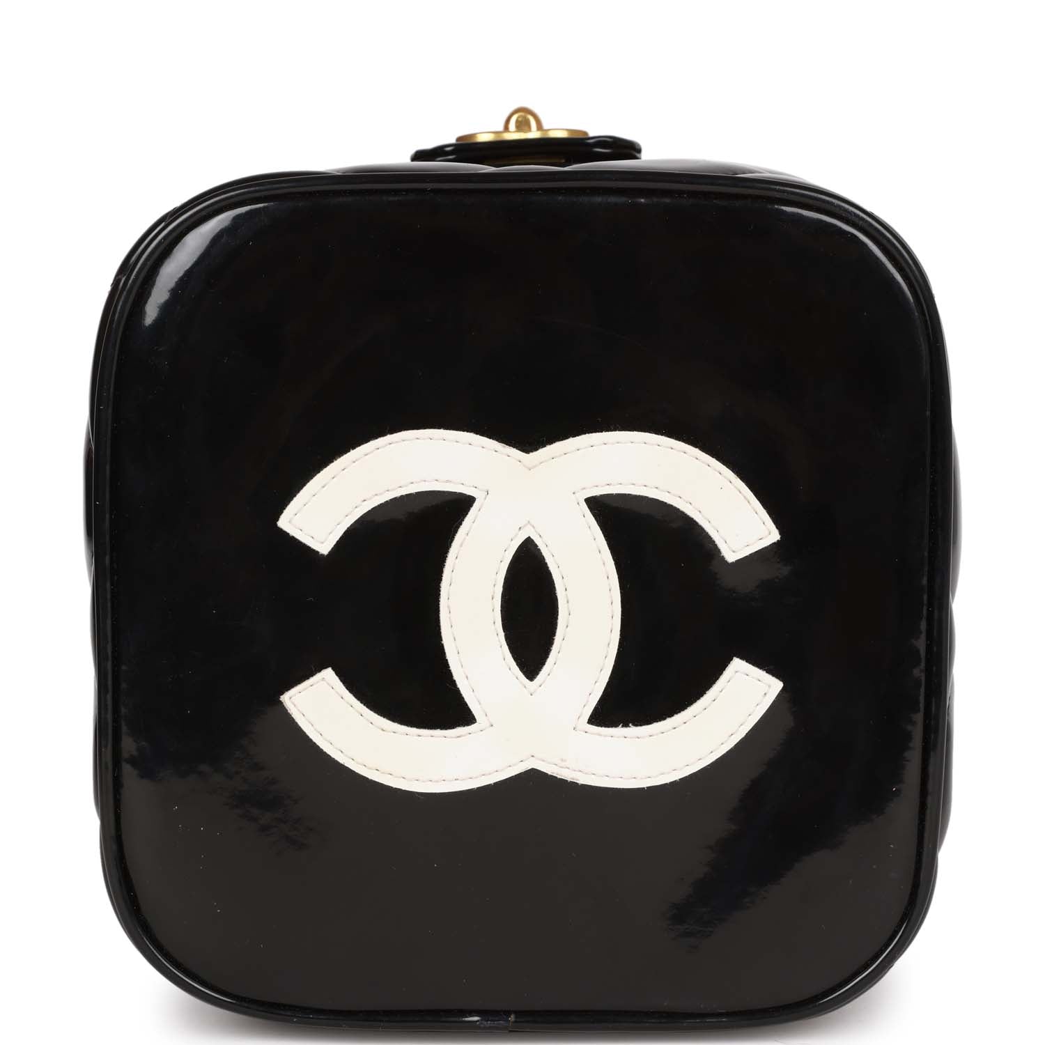 This Vintage Vanity Heart Mirror Bag is in Black quilted patent leather with gold hardware, a signature CC turnlock closure with a zip around closure, a white stitched CC logo at the base, and a rolled black top handle.