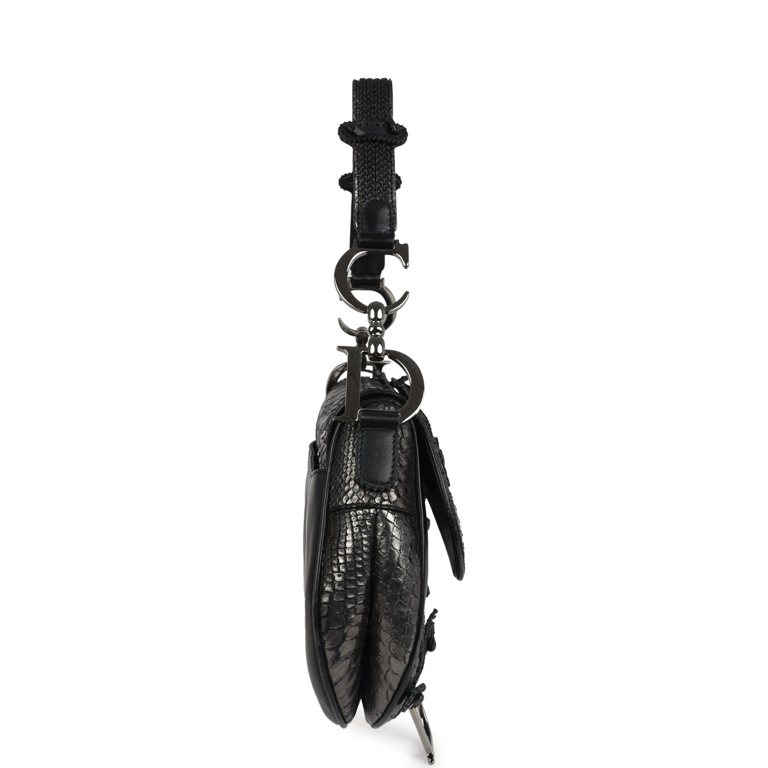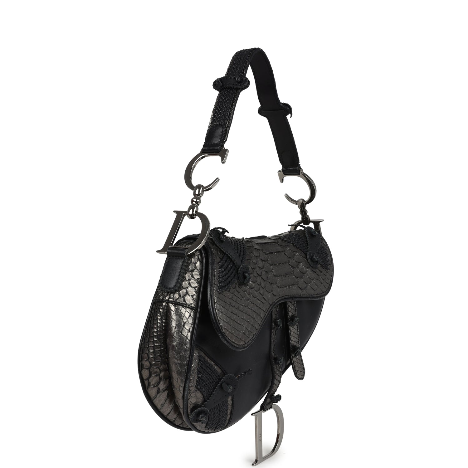 This vintage Christian Dior Saddle Bag is gunmetal python and black leather with silver hardware, featuring tonal stitching, leather trimming and detailing, a saddle flap with a D stirrup clasp on a velcro strap, back exterior pocket, and silver-finish metal signature "CD" on both side of the leather shoulder strap.