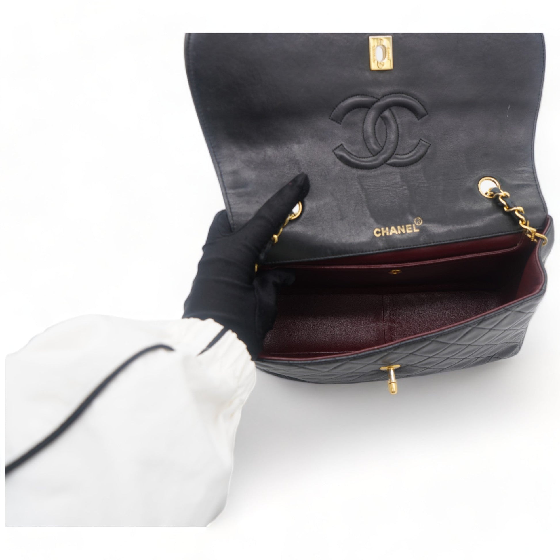 | This vintage 1st series beauty is crafted in lambskin with the iconic CC turnlock closure, single flap opens up to burgundy leather interior with slit pocket. Finished with the gold-tone intertwined leather chain shoulder strap. | Material: Leather Lining: Leather Hardware: Gold color finish metal Accessories: Serial Number: 1484968 Production Year: 1989 | ![]() |