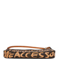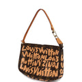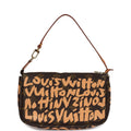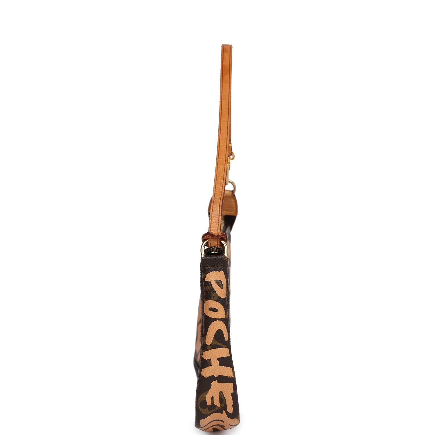 This Vintage Louis Vuitton x Stephen Sprouse 2001 pochette bag is in brown monogram coated canvas with gold tone hardware, peach graffiti inspired print, zipper closure, vachetta leather trim, and a shoulder strap/handle.