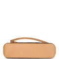 The interior is lined in brown canvas and there's one interior zip pocket on rear wall with gold zipper pull.