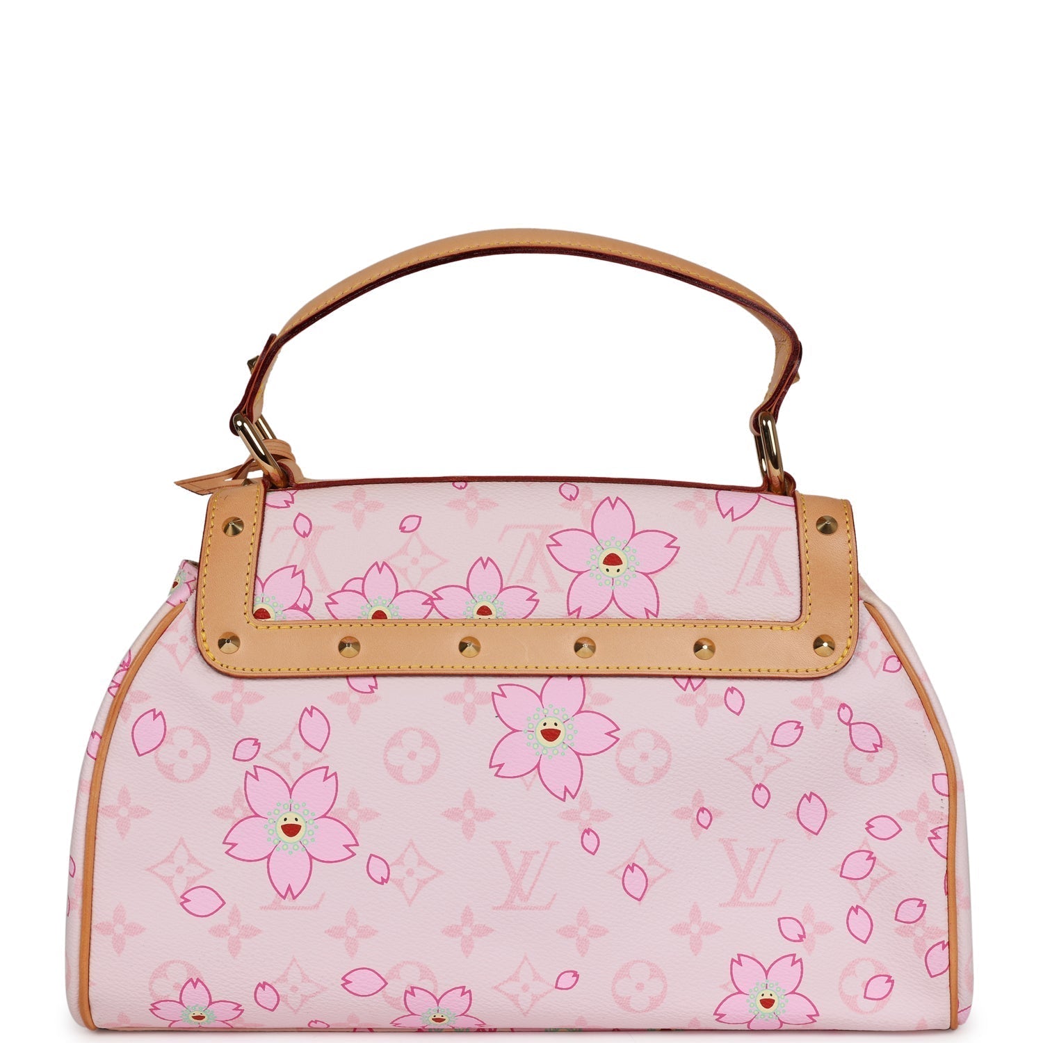 This Limited Edition Louis Vuitton x Takashi Murakami Sac Retro bag is in Pink Cherry Blossom monogram coated canvas with gold tone stud hardware, Vachetta leather trim, and top handle.