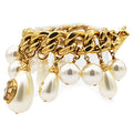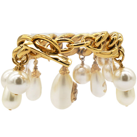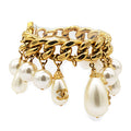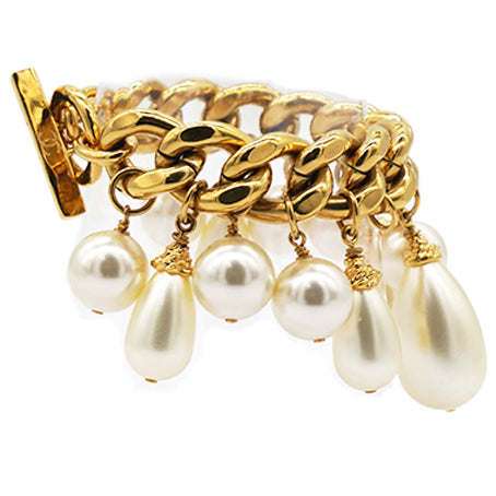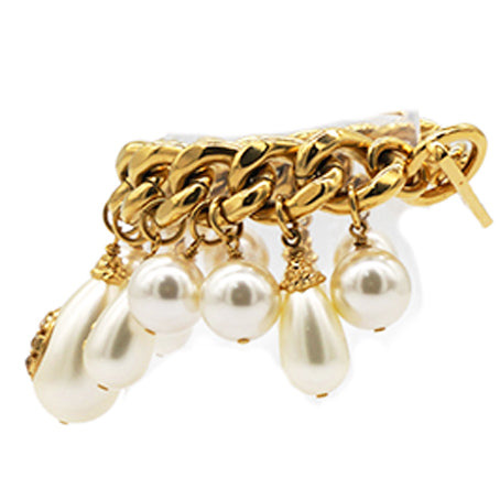 | Very rare, coveted vintage bracelet by Chanel. Super cool design featuring oversized round and teardrop shaped pearls dangling from a chunky, gold plated, molded chain cuff bracelet. This bracelet is the epitome of the Karl Lagerfeld reign, and embodies the iconic supermodel era ads/editorials. Pearls bounce around, and the bracelet can be worn either way depending how'd you like the pearls to look. | Material: Gold Plated Metal?Faux Pearl Measurement: Bracelet wrist size:18.5 cm Accessories: | ![]() |