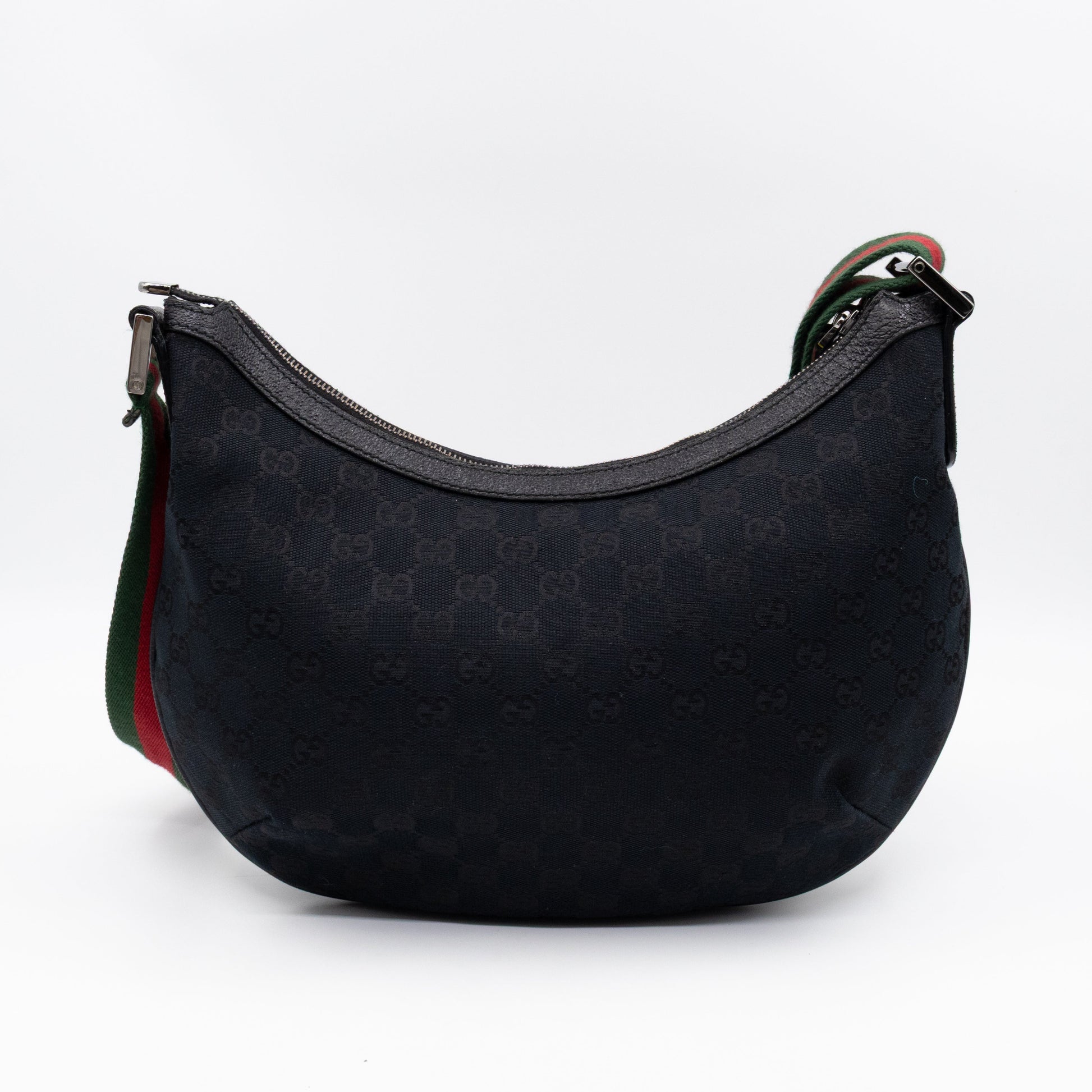 This is a Gucci web hobo messenger bag. Made in black GG monogram canvas with black leather trims and gold-tone hardware. It has an adjustable web canvas strap for easy carrying. The top zipper opens to matching fabric interior with a zipper pocket and patch pockets. Great for daily use.
