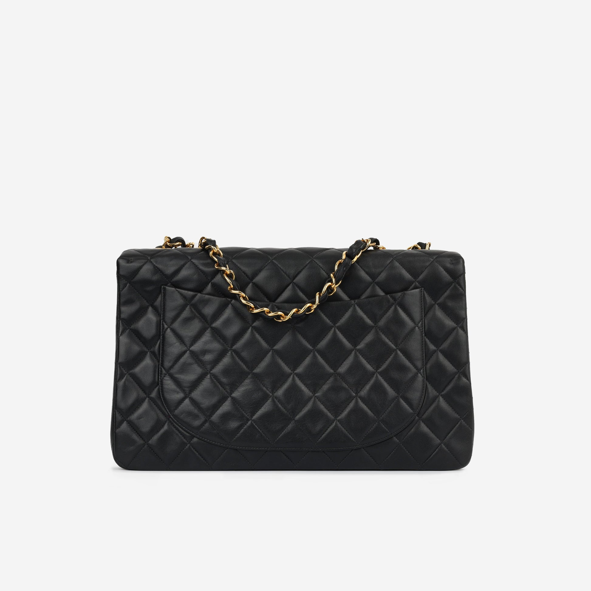 For all the vintage Chanel lovers, this one's for you. This rare Chanel Mademoiselle Flap Bag in XL Jumbo size definitely not easy to find. With its smooth, quilted lambskin leather, gold tone hardware and XL CC logo clasp, this bag is elegant and sophisticated. Ideal for day-to-night usage, you can fit your whole world comfortably inside. Timeless, classic and the ultimate addition to any luxury handbag collection, this vintage gem is a true must-have.