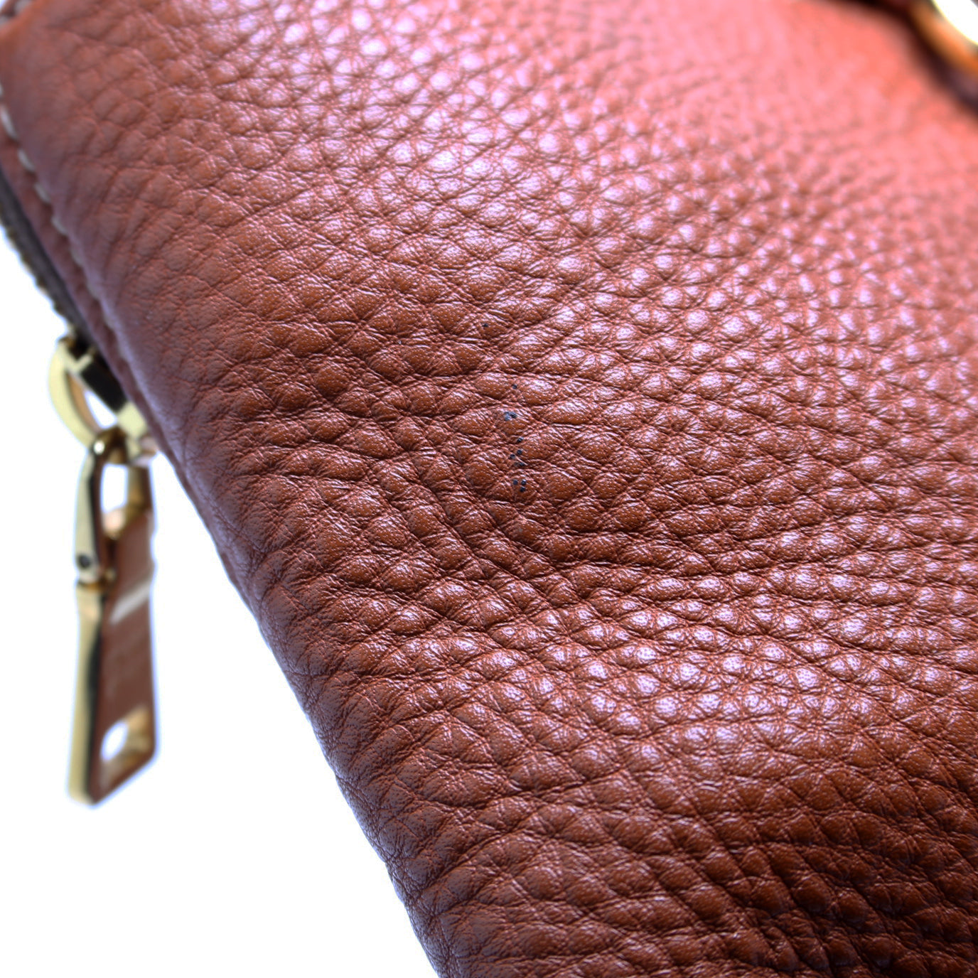 Interior: The interior is clean and free of rips or tears. The interior features one snap closure pocket and one zip closure pocket.