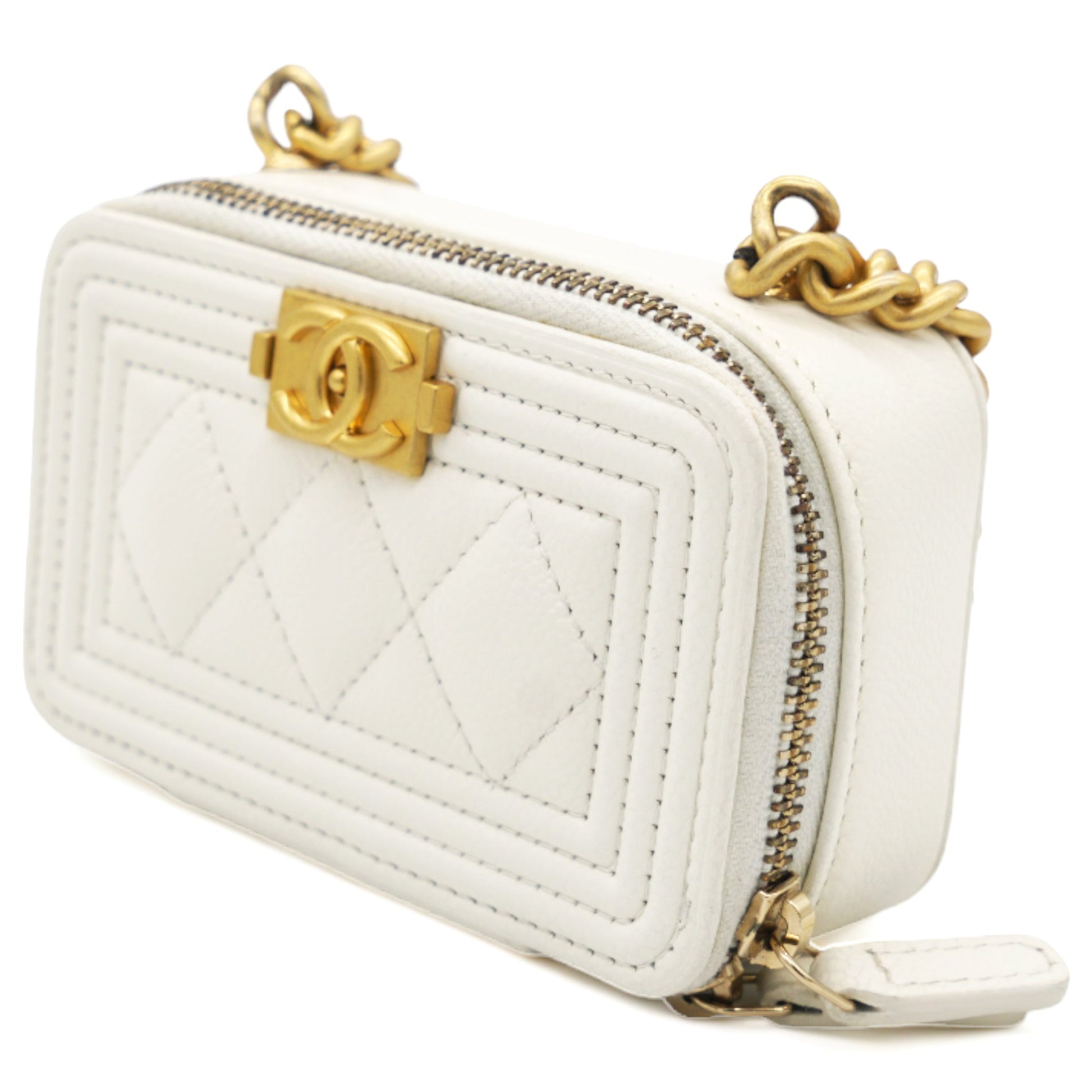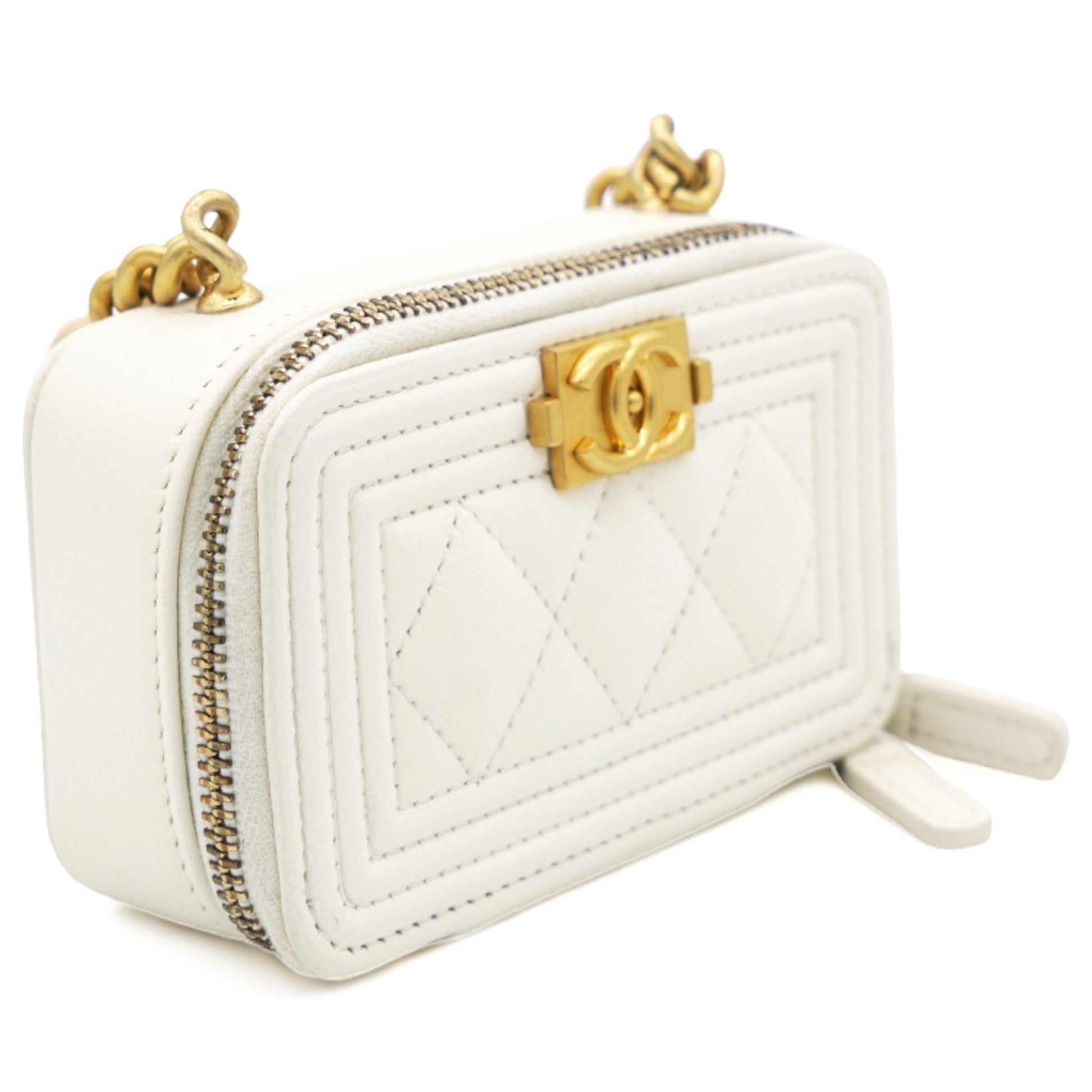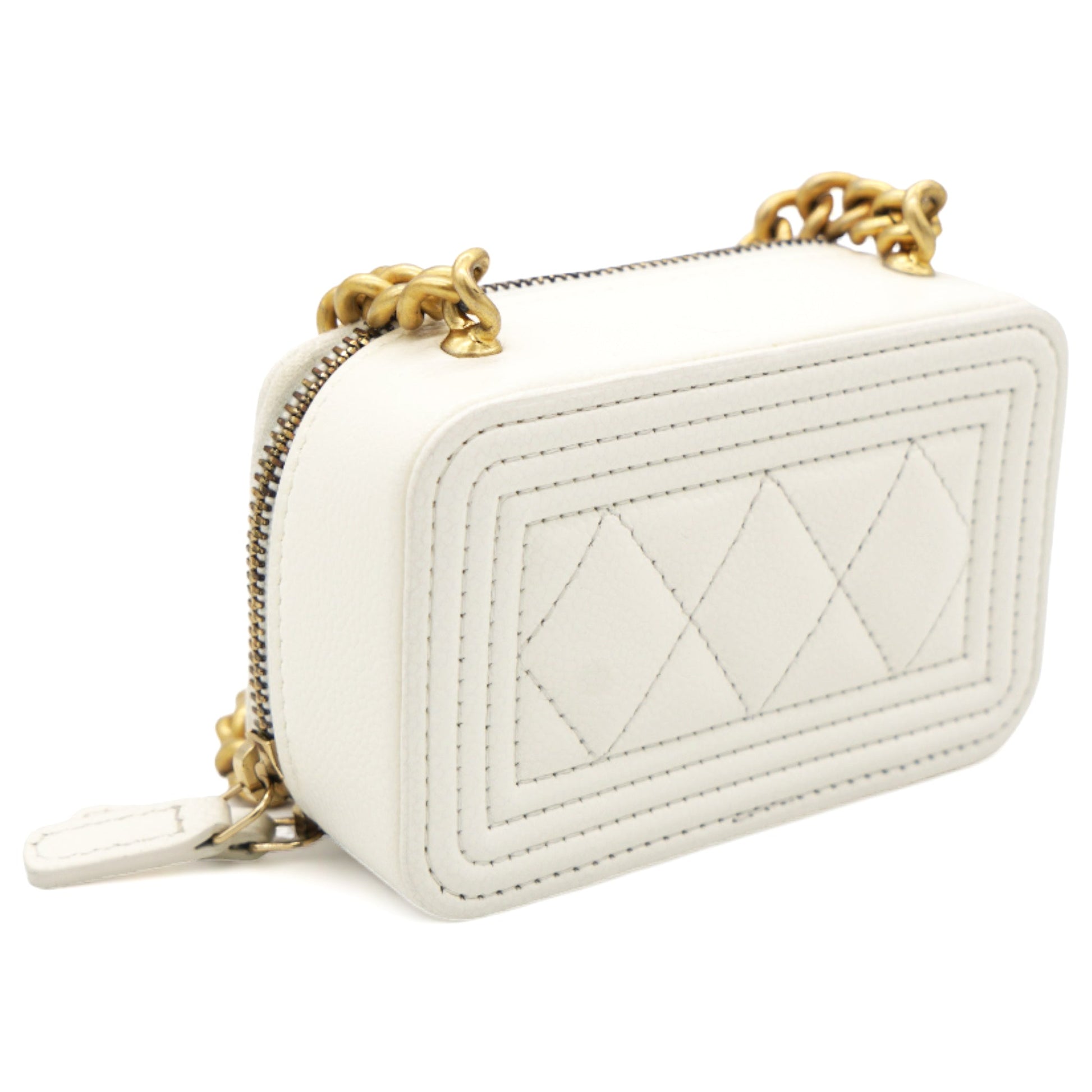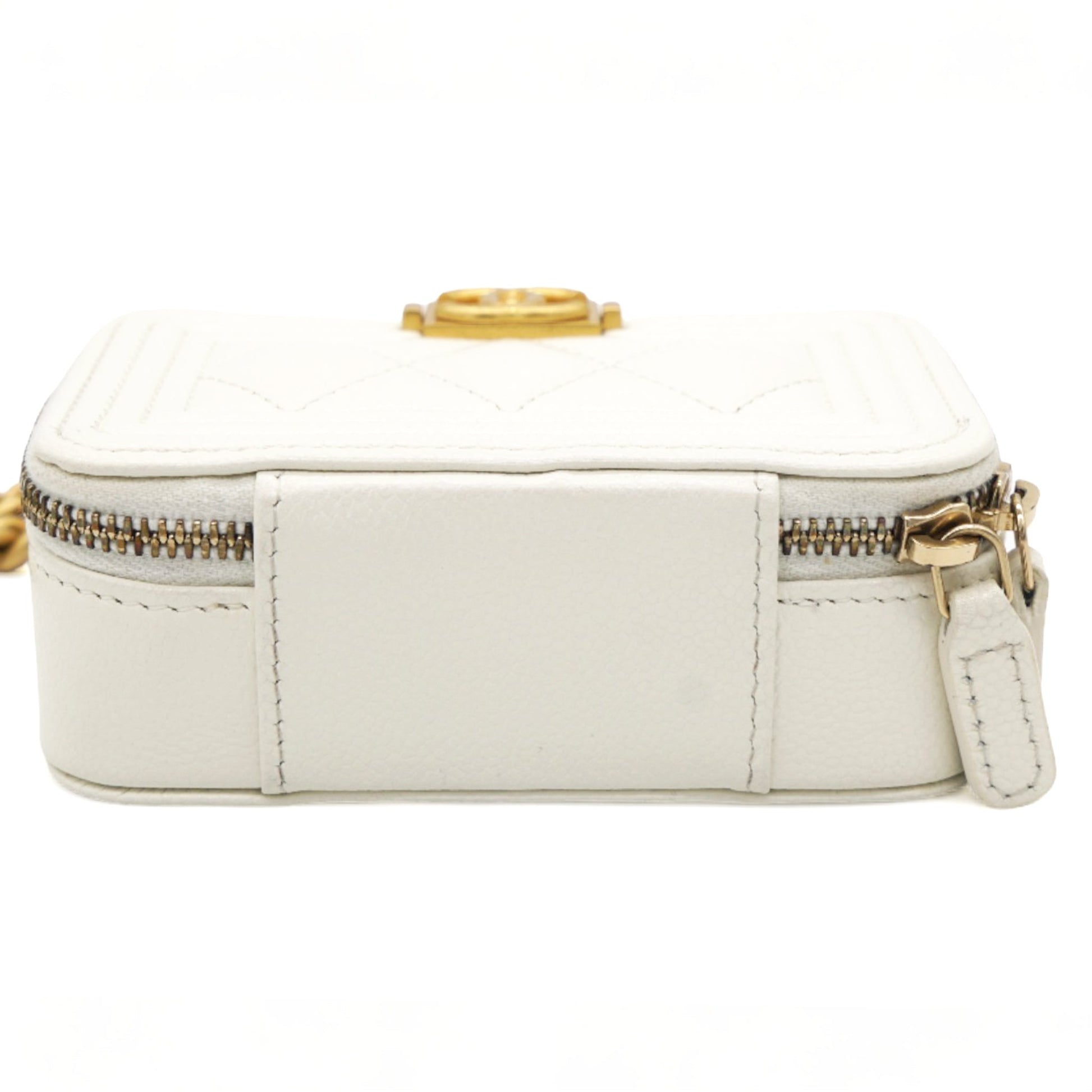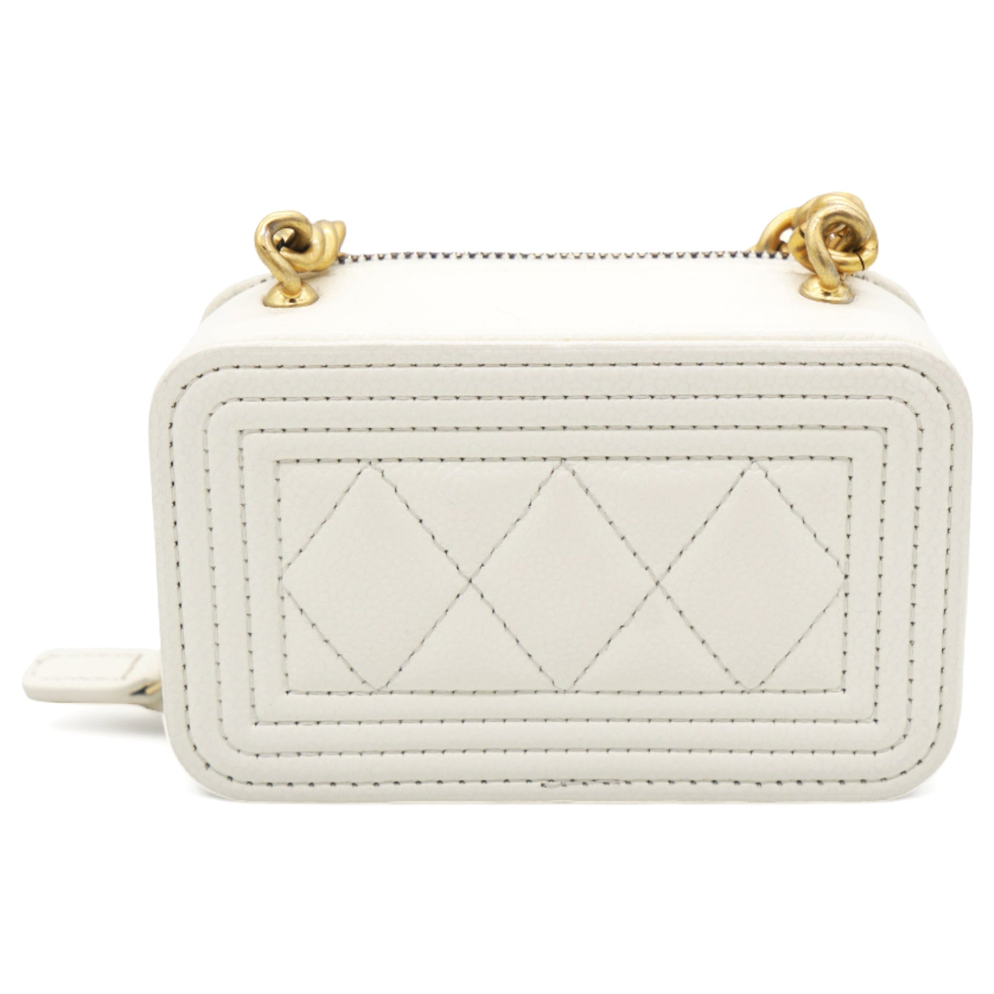 | This cardholder from Chanel is absolutely gorgeous to look at! Crafted from caviar leather in white, it features the signature quilts, the Boy CC logo on the front zip, and a brushed gold chain link for you to parade it in style. Organize your essentials in style with this beautiful creation. | Material: Leather Lining: Textile Hardware: Gold color finish metal Accessories: Serial Number: P835P2UC Production Year: 2022 | ![]() |