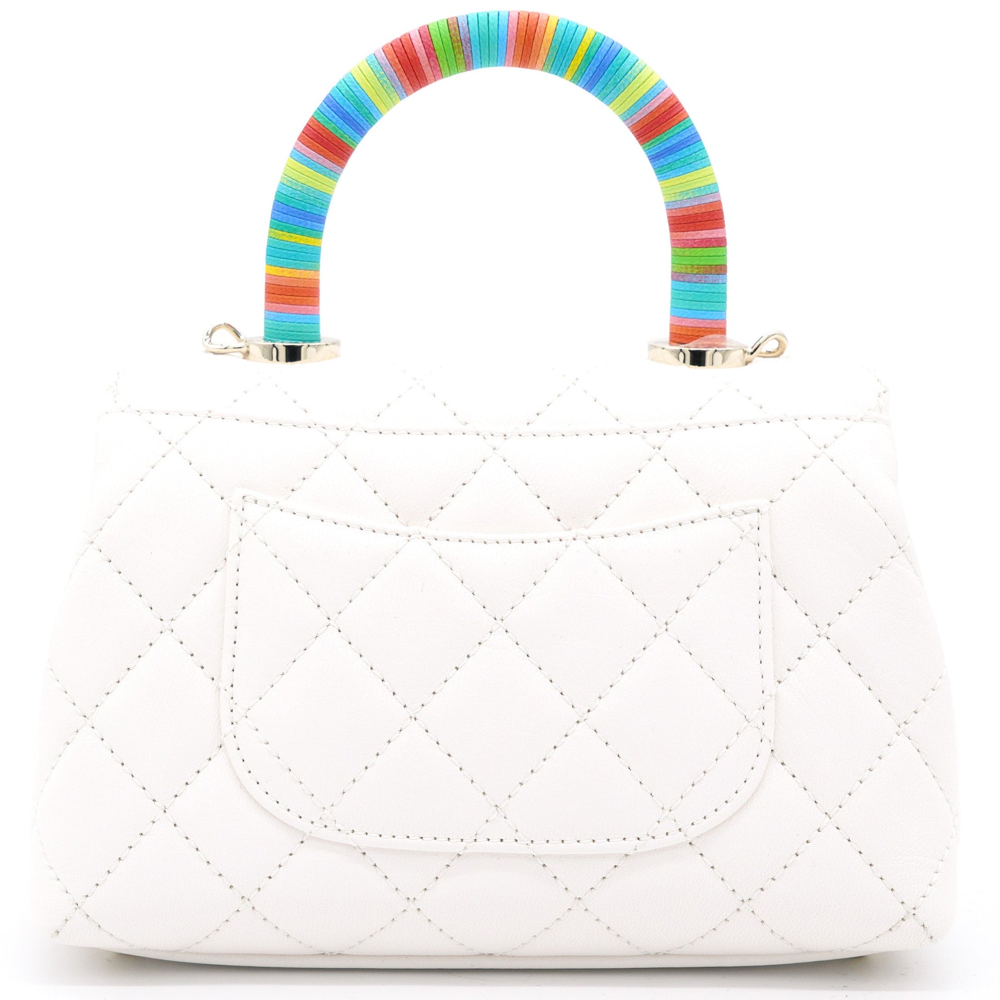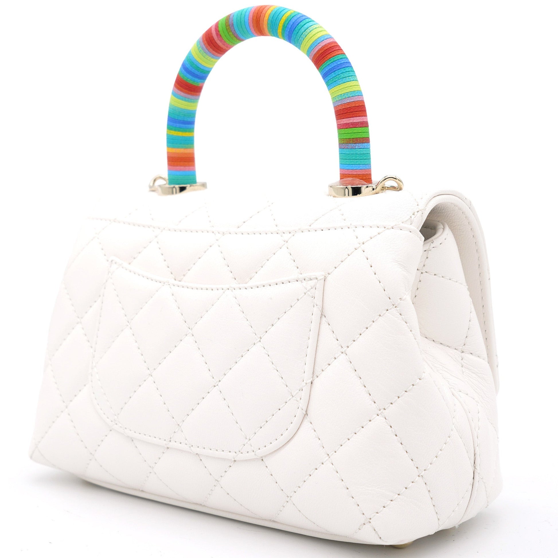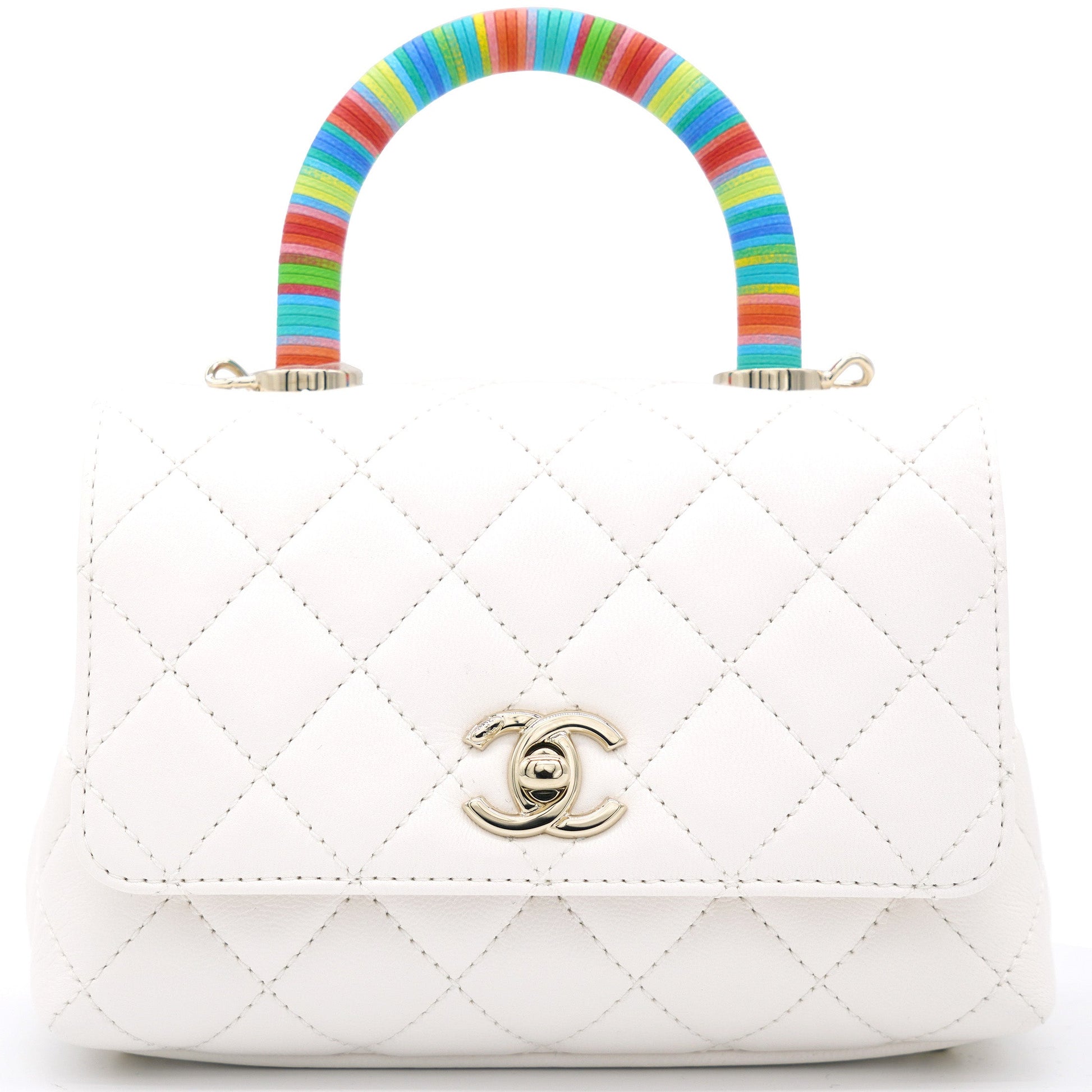 | Featuring the timeless elegance and the classic look of a Chanel bag along with modern convenience of a long strap, this beautiful Mini Coco bag comes with rainbow details top handle. Crafted in white quilted caviar leather, this bag features a rolled top handle along with gold-tone hardware details and the iconic CC twist-lock closure on the flap that opens to a spacious fabric-lined interior. | Material: Leather Lining: Leather Hardware: Gold Finish Metal Measurement: Accessories: Box; Card; Dust Bag Serial Number: 31291548 Production Year: 2021 | ![]() |