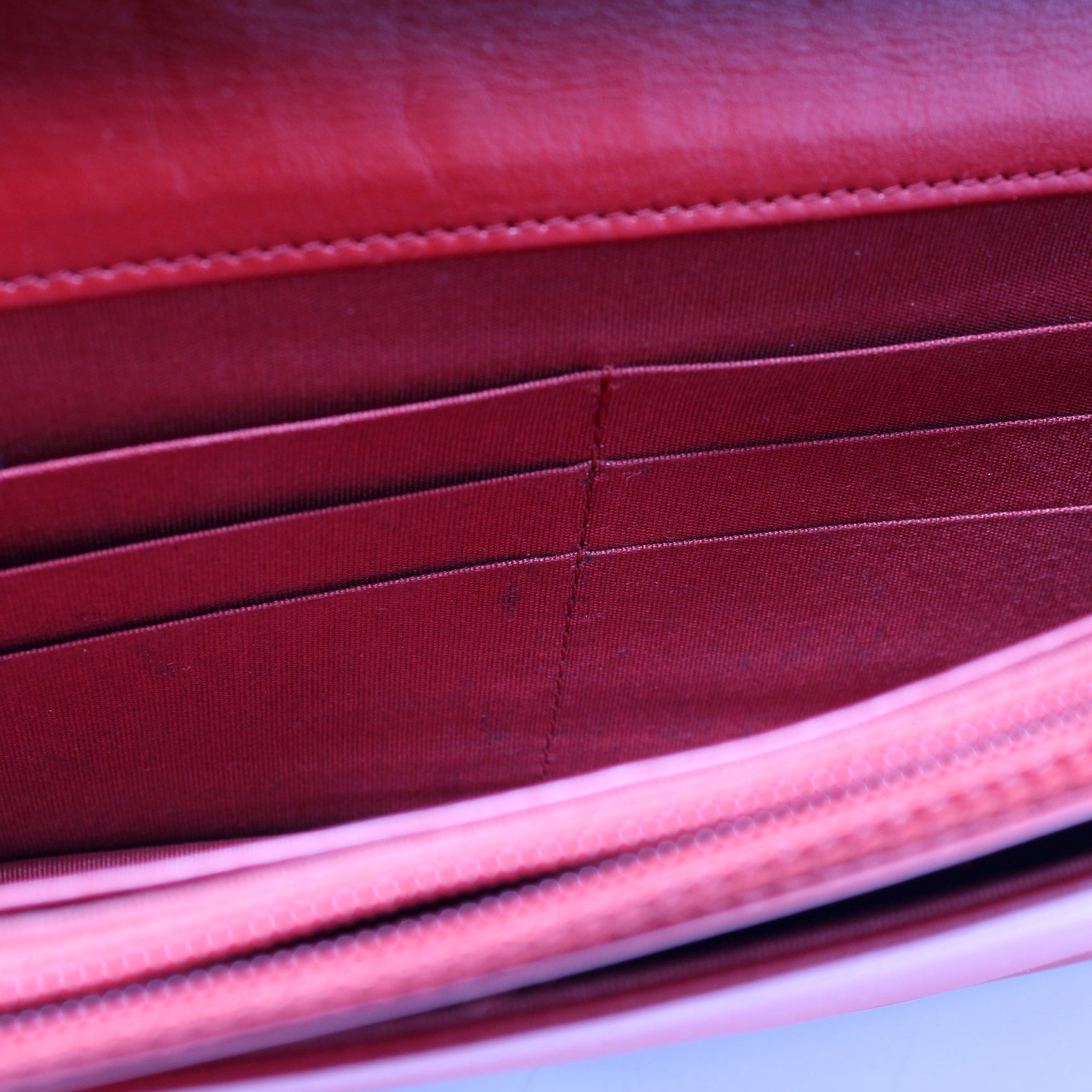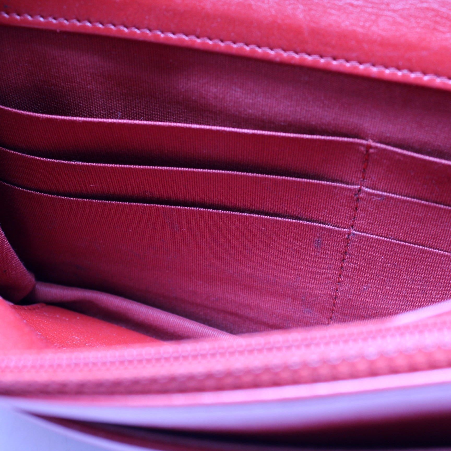 Interior: The interior is clean and free of rips or tears. The interior features two open pockets, six card lots, and two zip closure pockets.