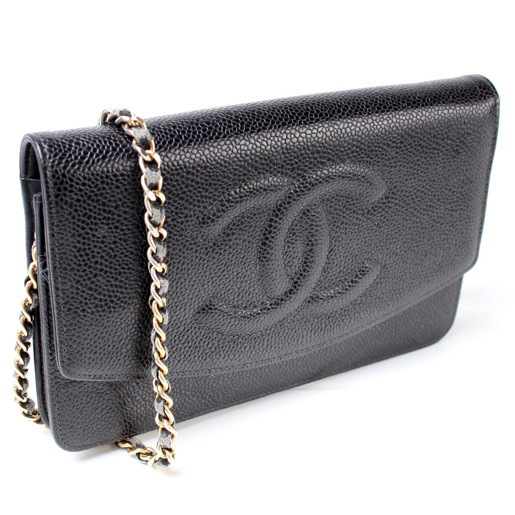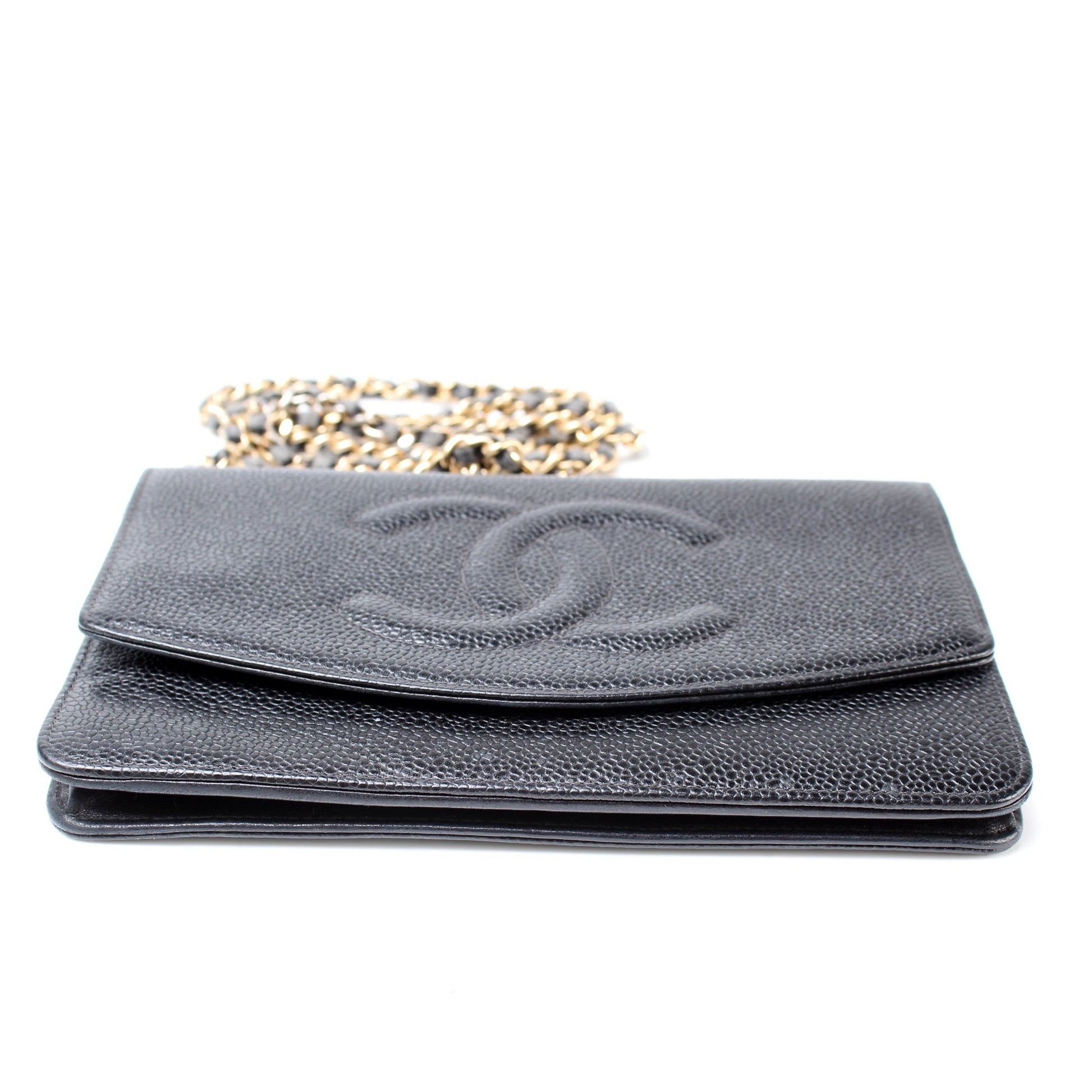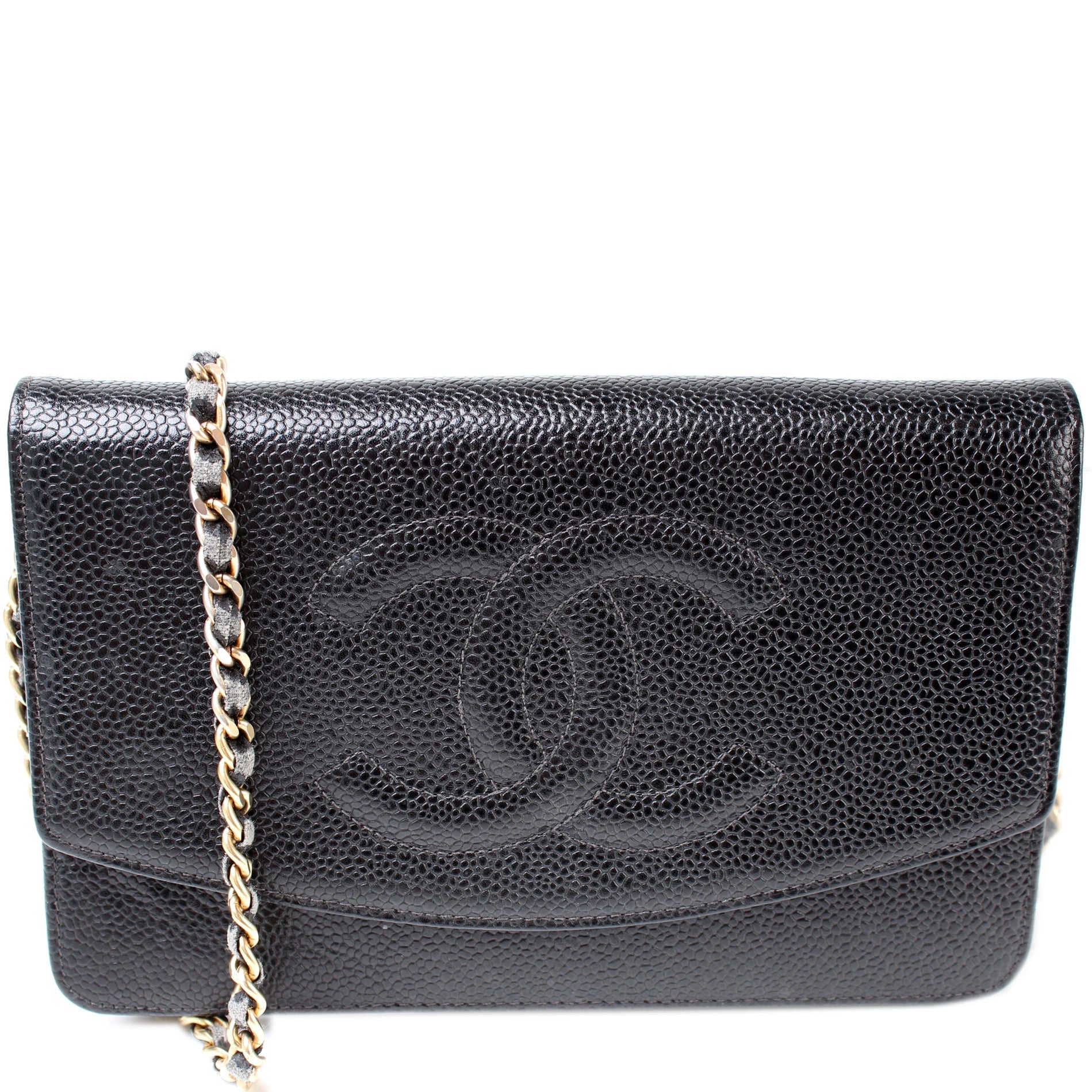 This Chanel WOC Timeless CCis eye catching bag. The exterior is in the classic Chanel Caviar leather.