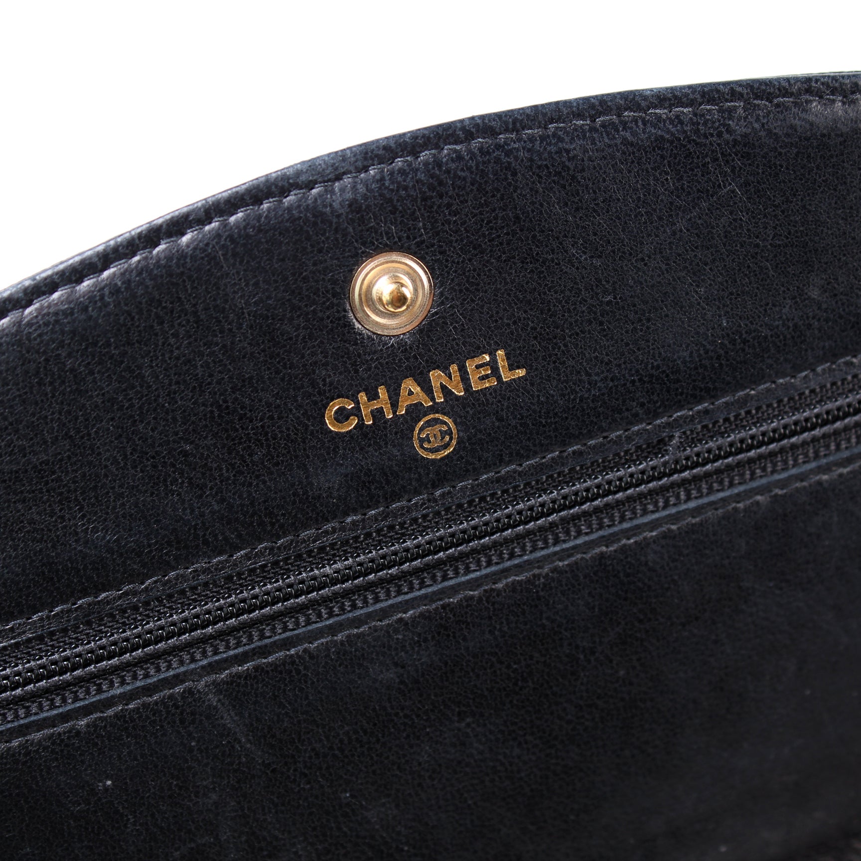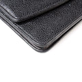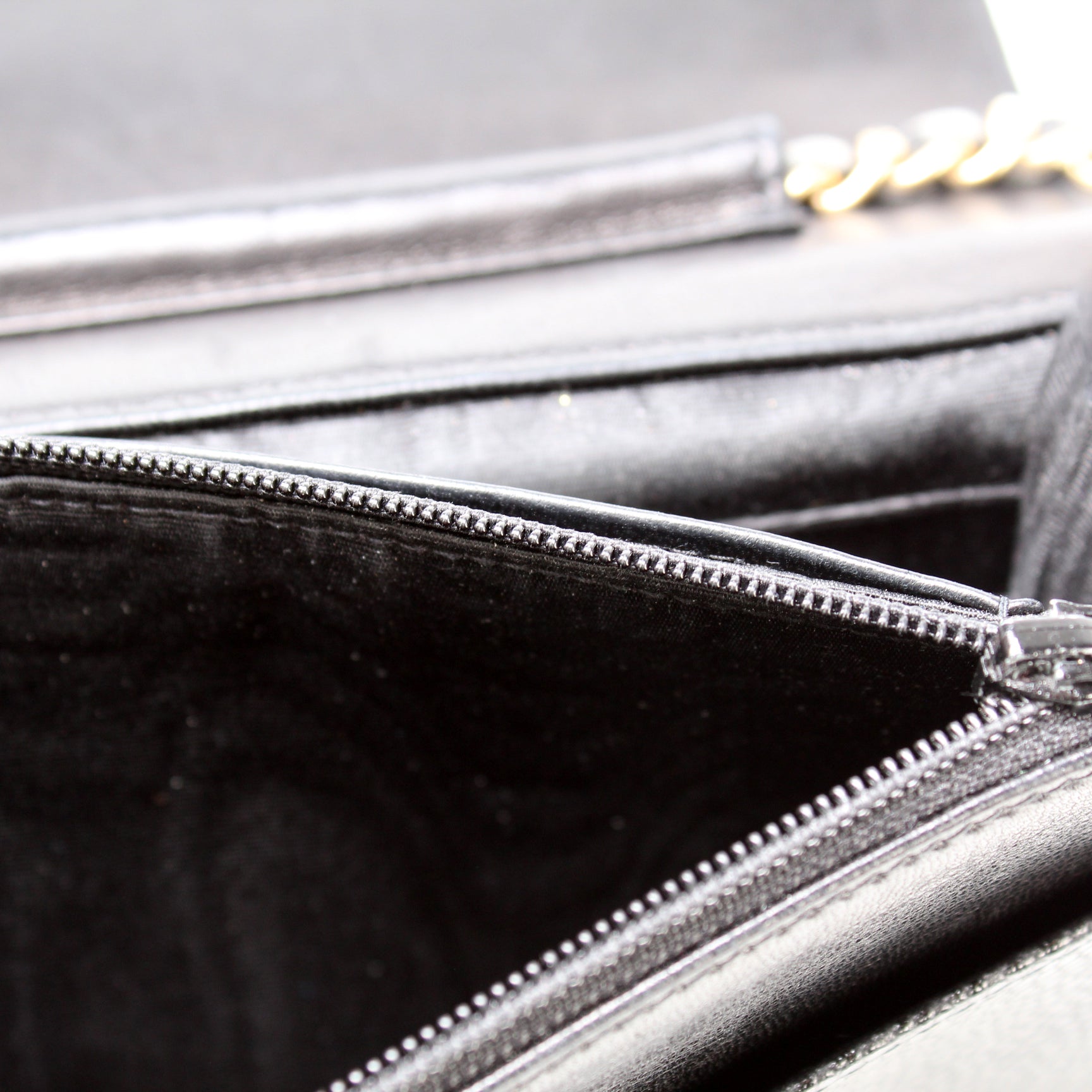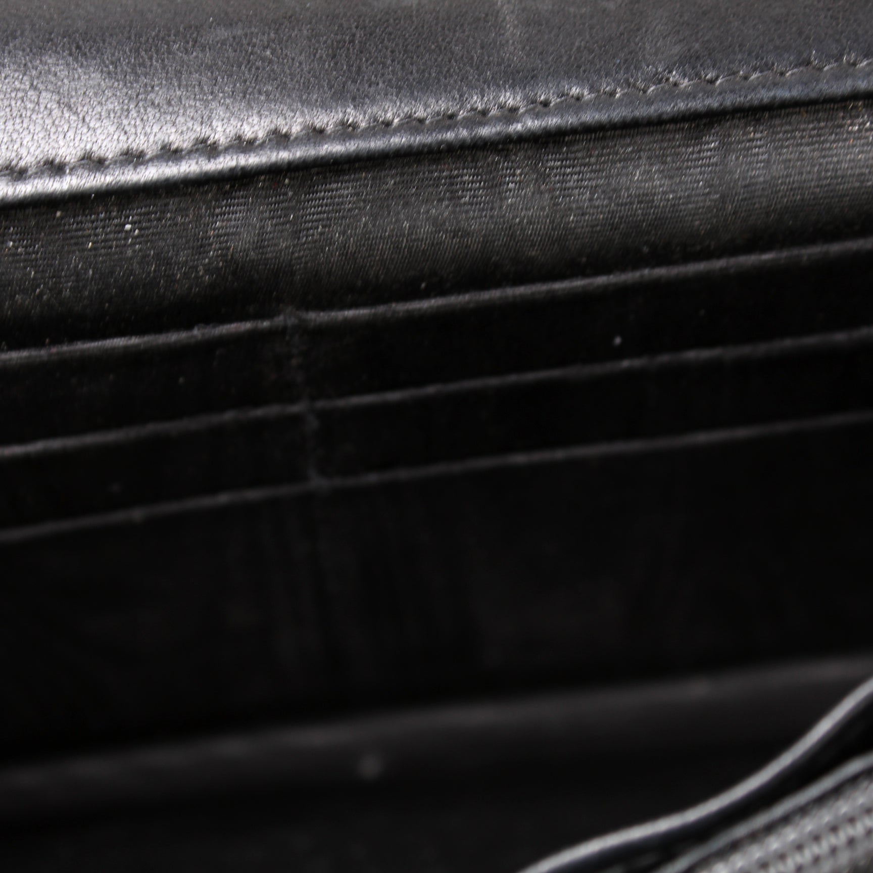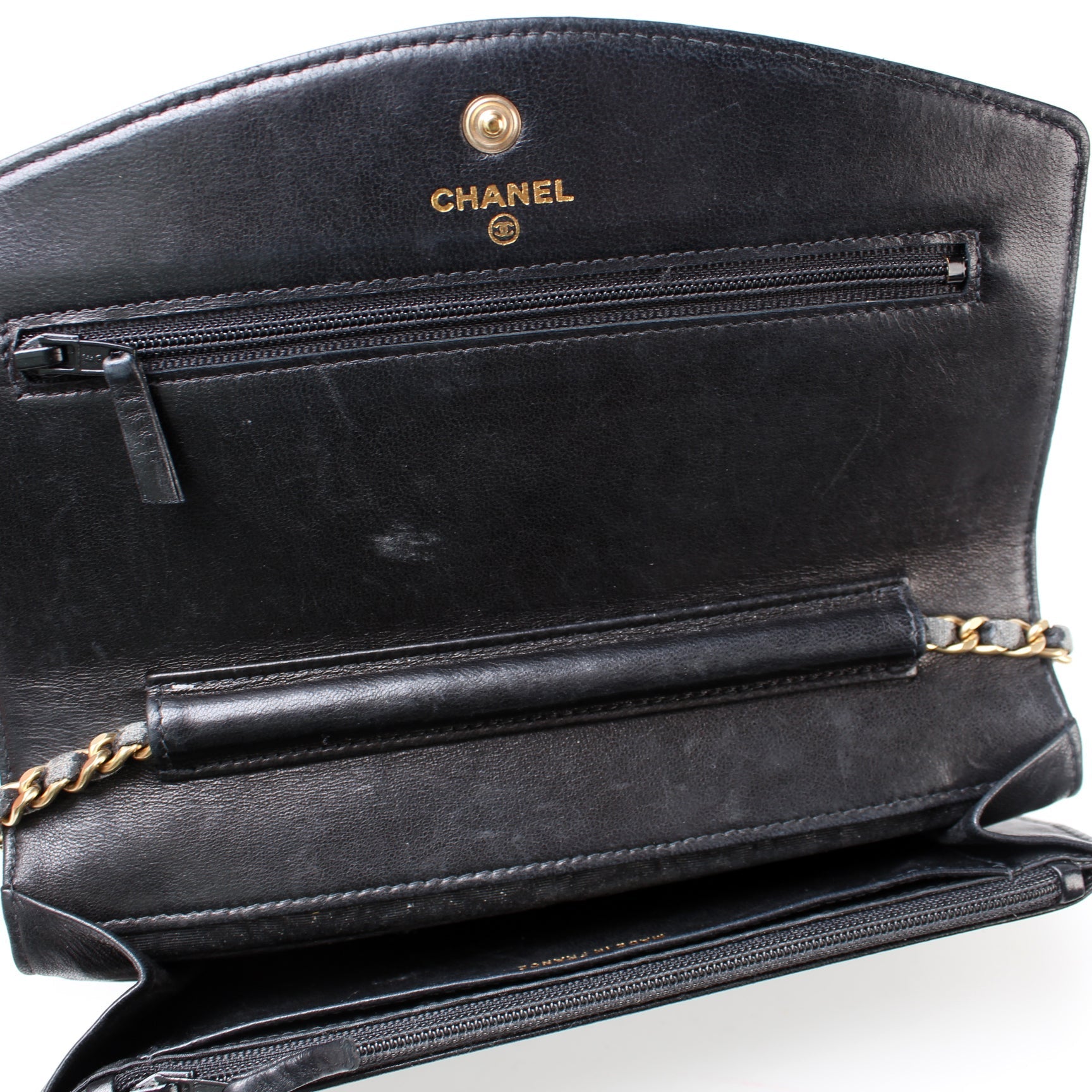 Interior: The interior shows minor signs of wear and scuffing throughout. The interior features six card slots, two zip closure pockets, and two open pockets.
