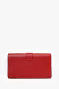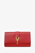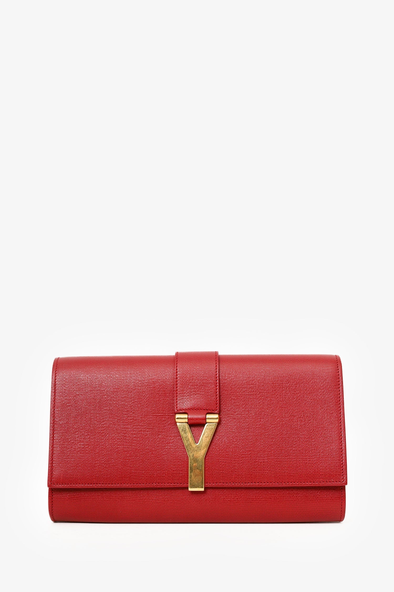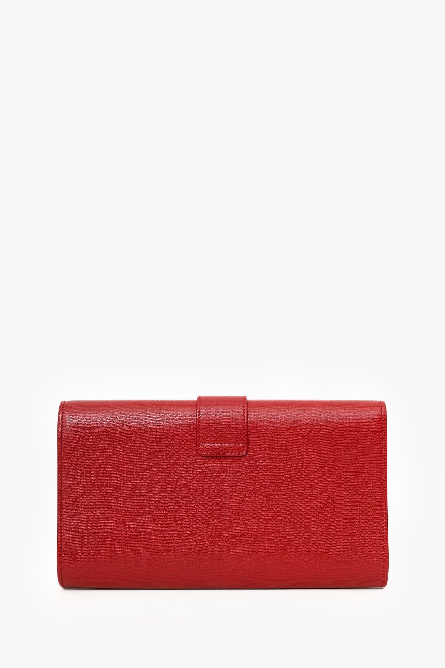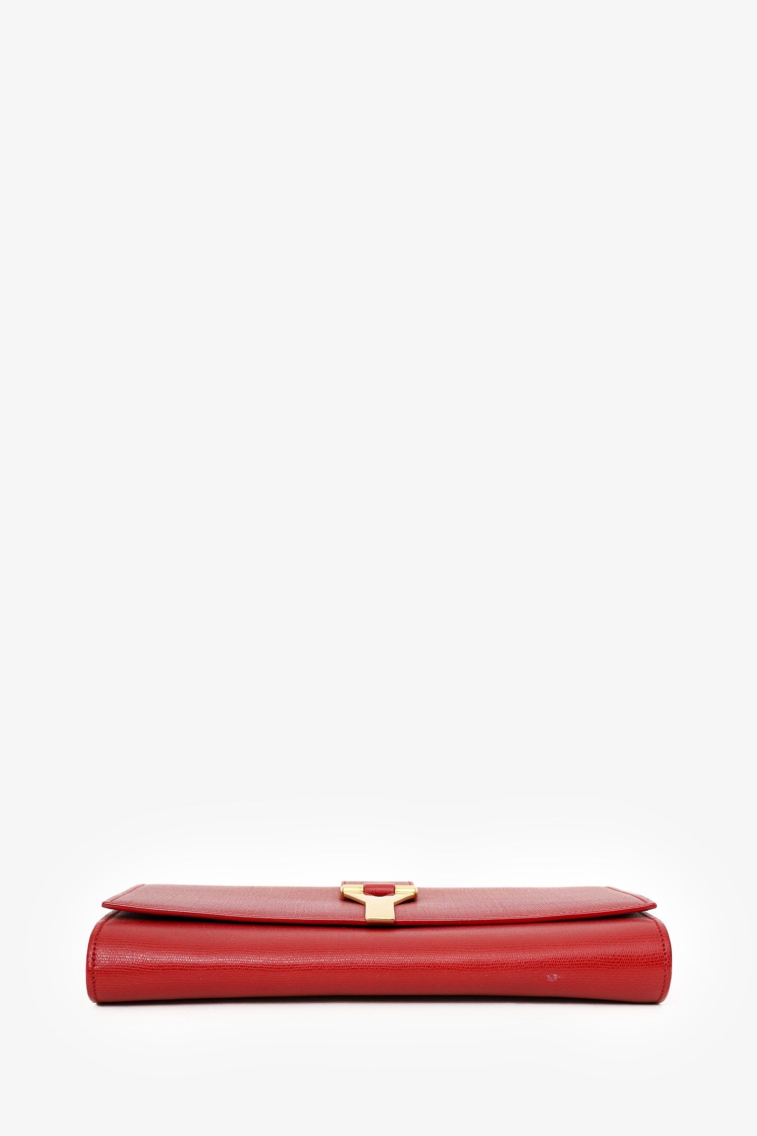 Yves Saint Laurent Red Leather Ligne Clutch. Magnetic button closure. Interior wall slip pocket. Gold-tone hardware. Tonal stitching.